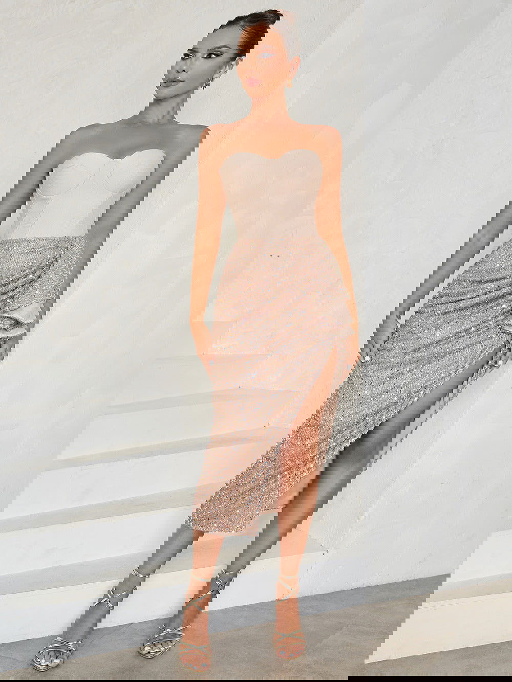 Bandage Dress Simple Tube Top Backless Stitching Sequ High Slit Ruffled Slim Dress