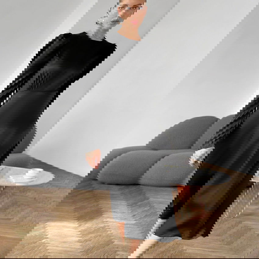 Black Thick Matte Satin round Neck Puff Sleeve Russian Office