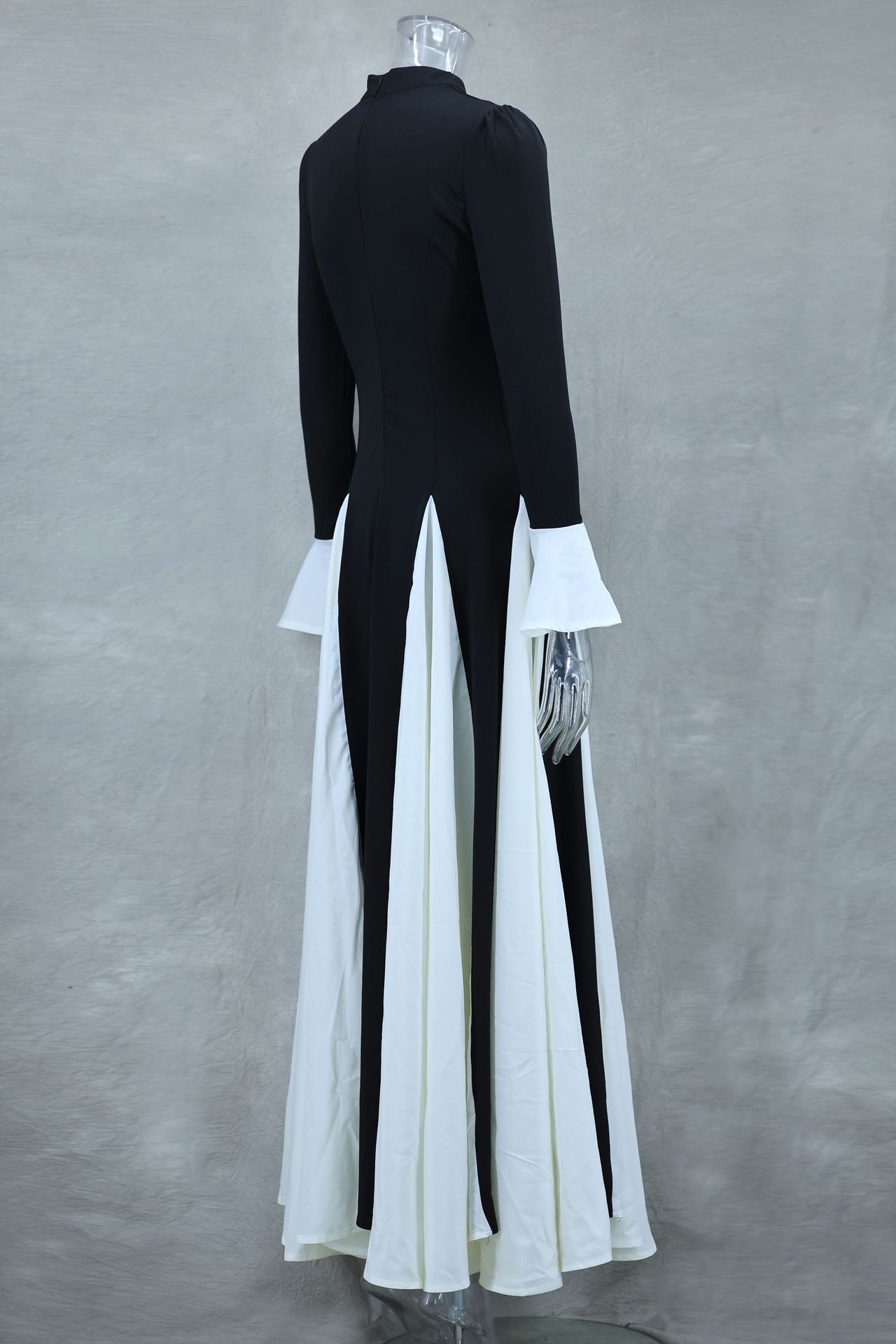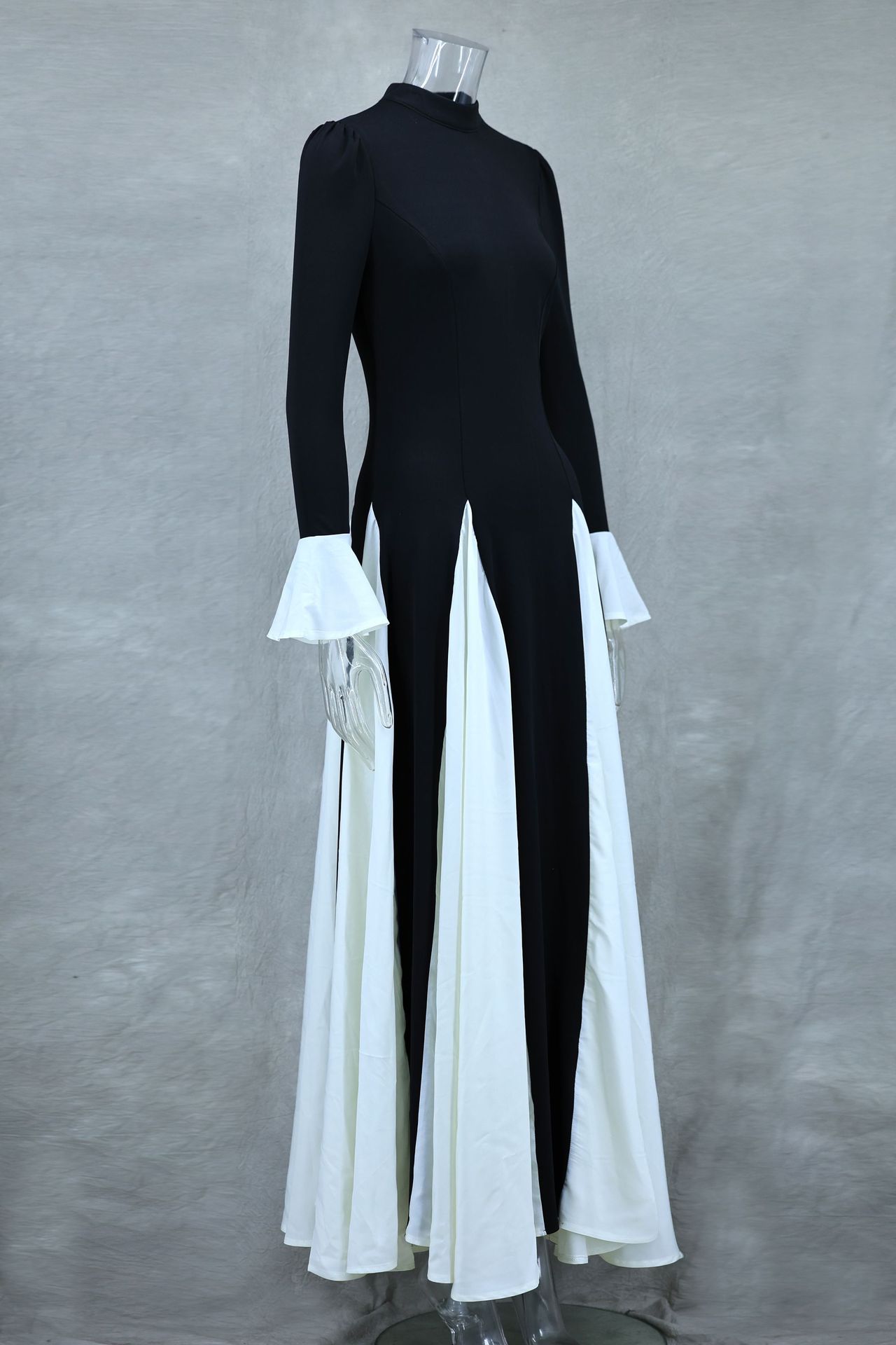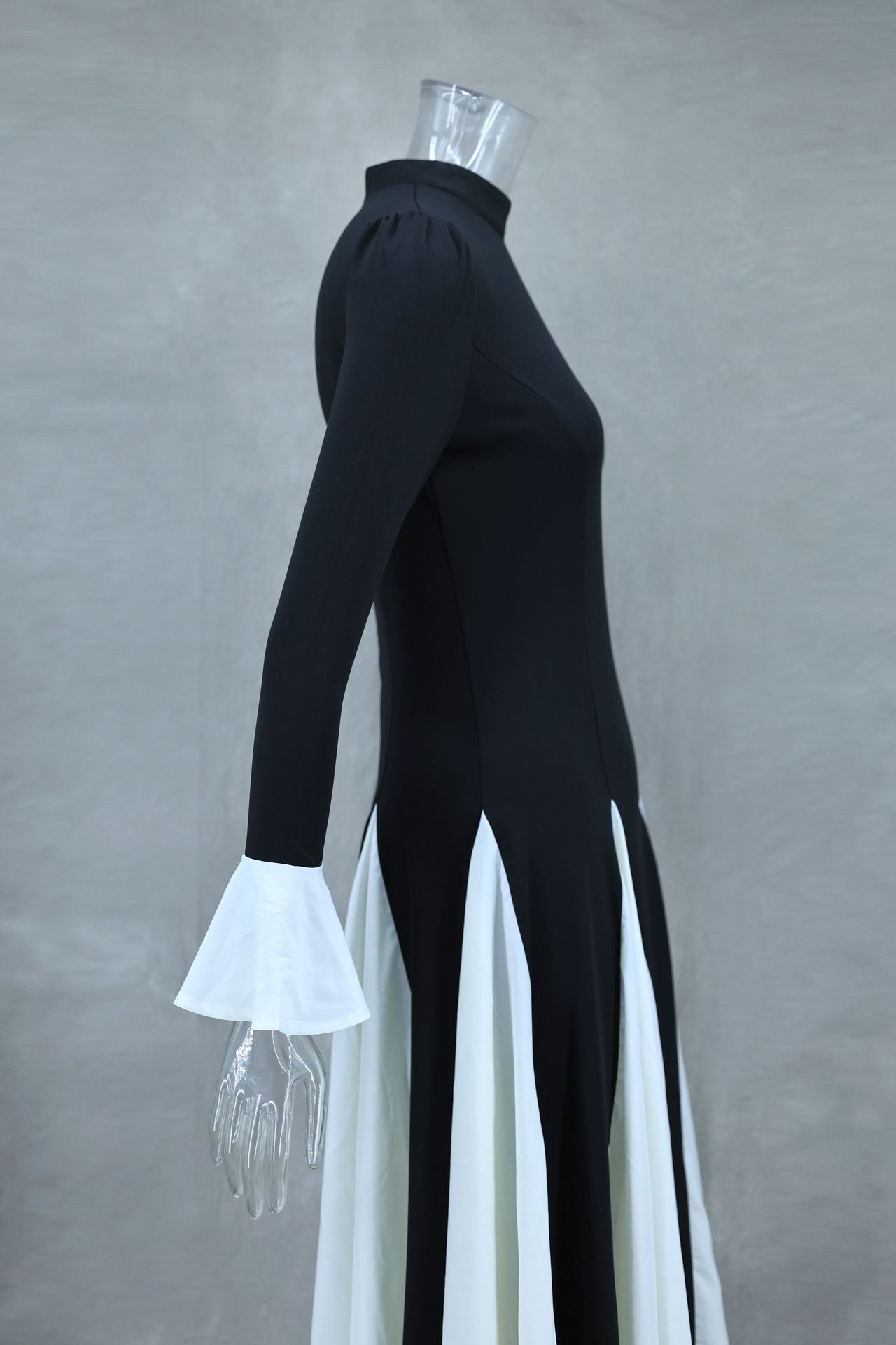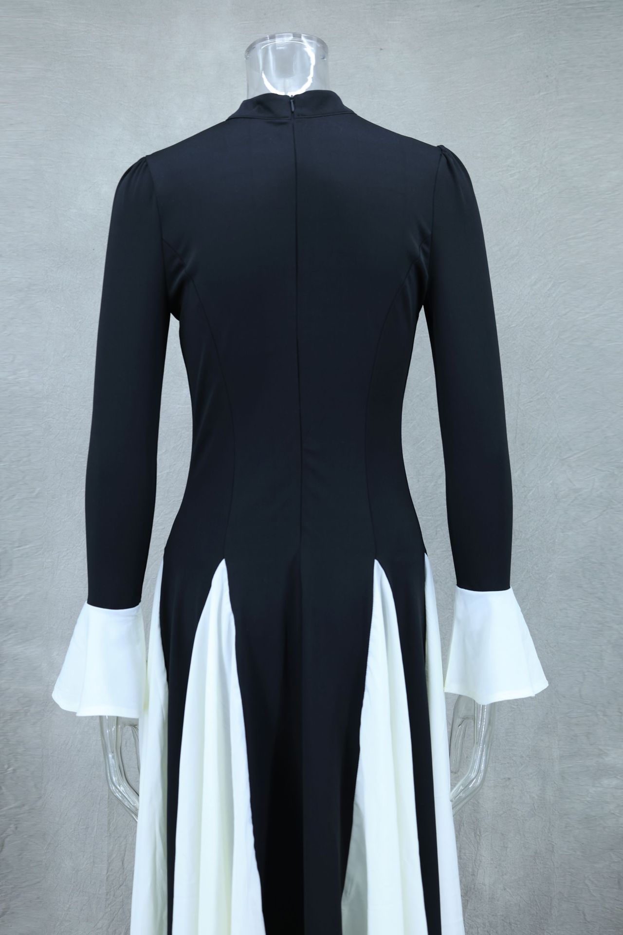 Black White Contrast Color Elegant Ruffle Long Sleeve Big Hem Dress