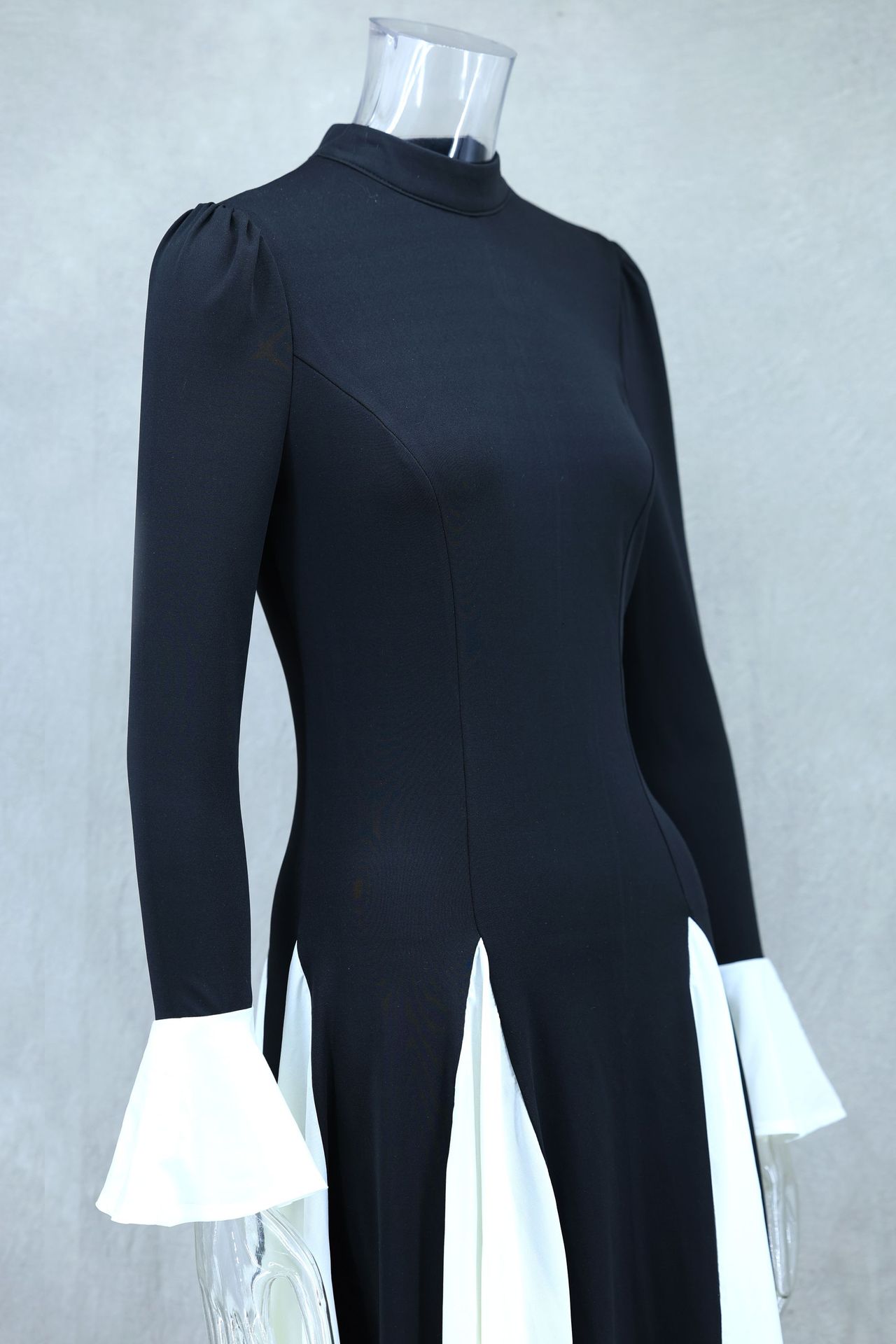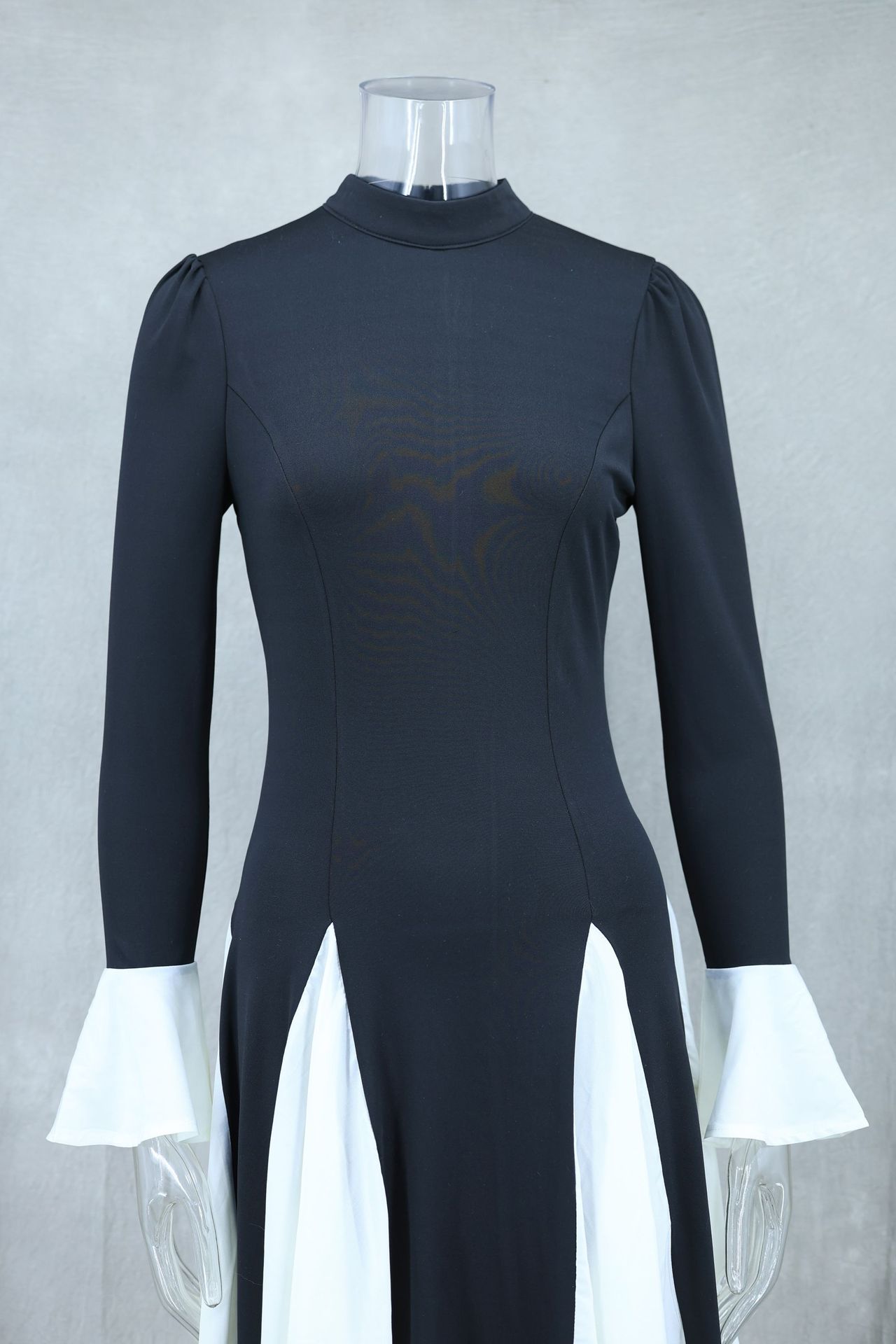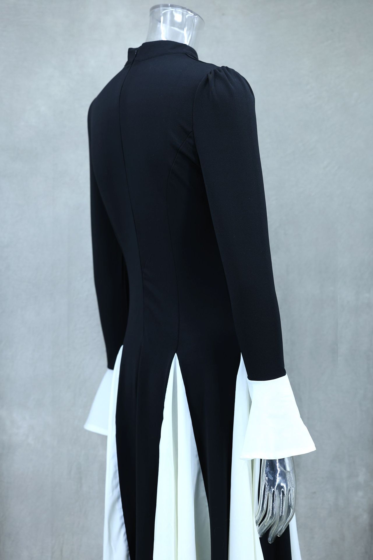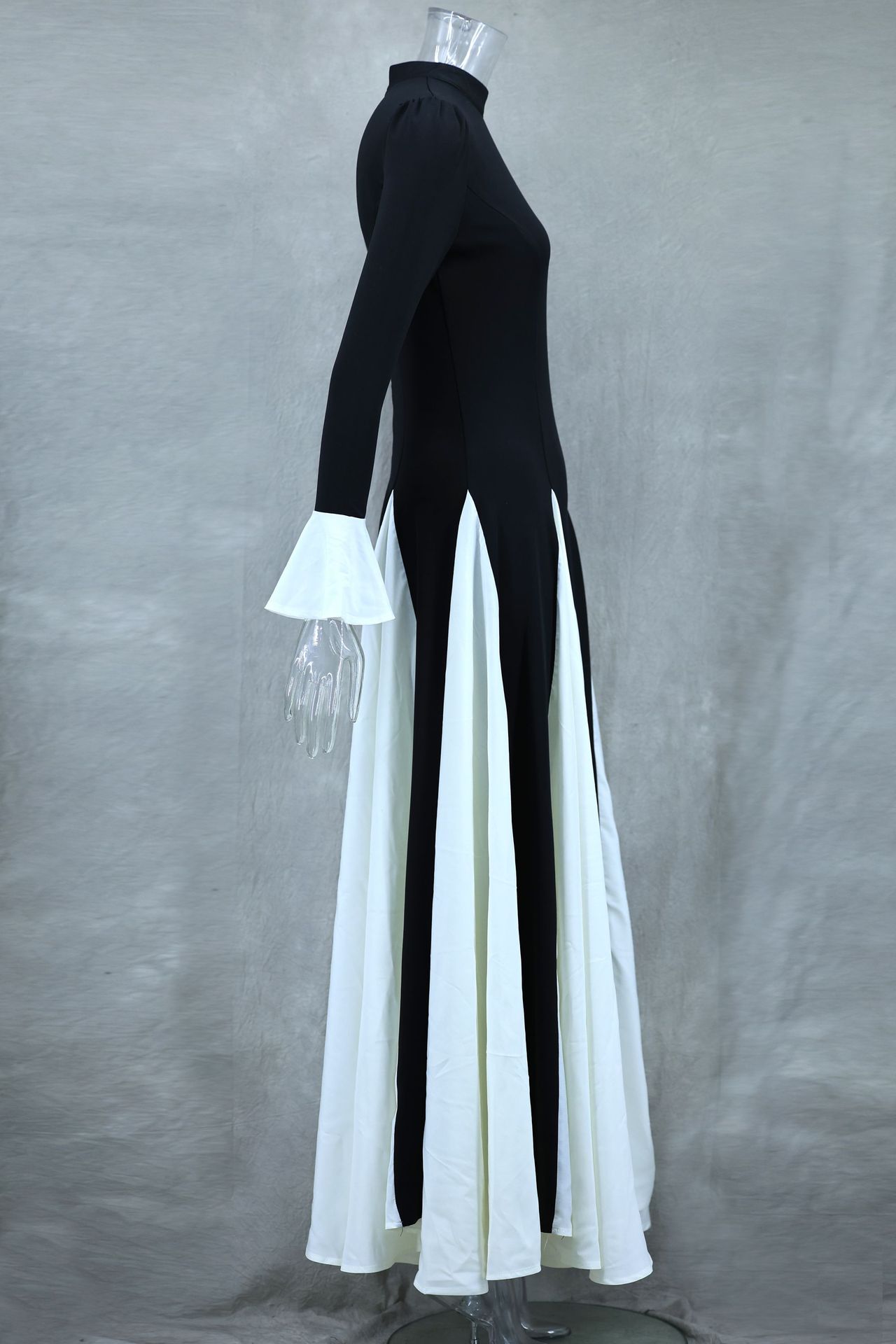 Black White Contrast Color Elegant Ruffle Long Sleeve Big Hem Dress