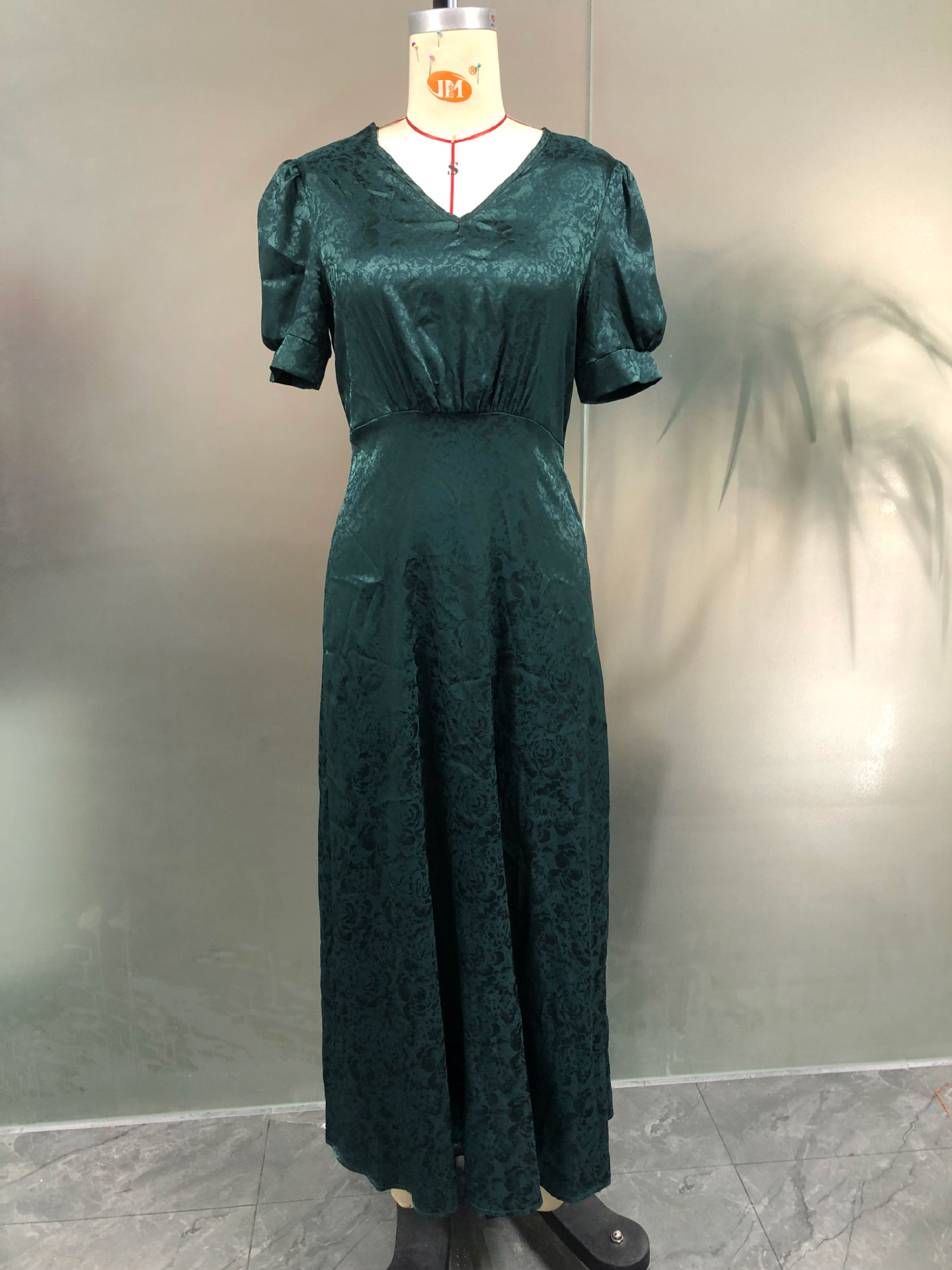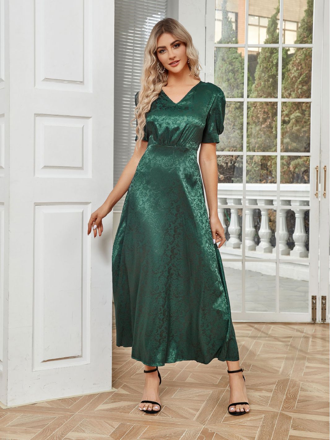 Casual High Waist Solid Color V neck Puff Sleeve Dress