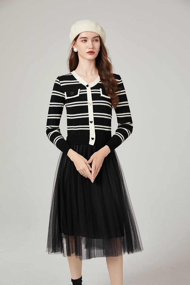 Chanel Striped Knitwear Stitching Mesh Dress Elegant Yarn Dress