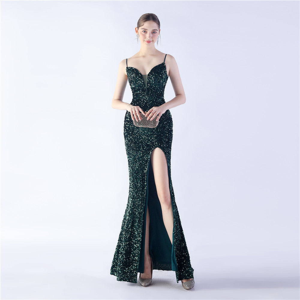 Colorful Sequin Side Slit Long Strap Evening Dress