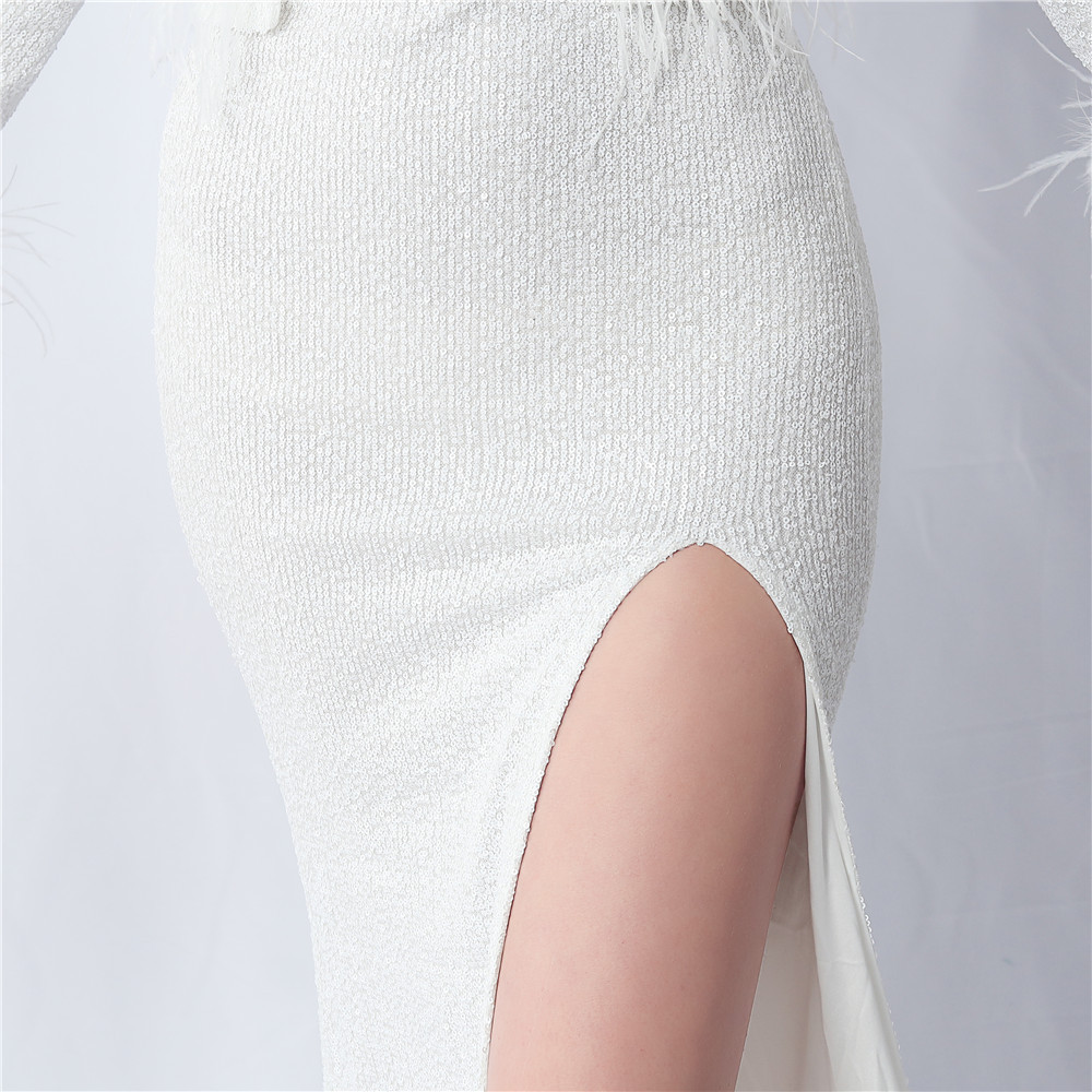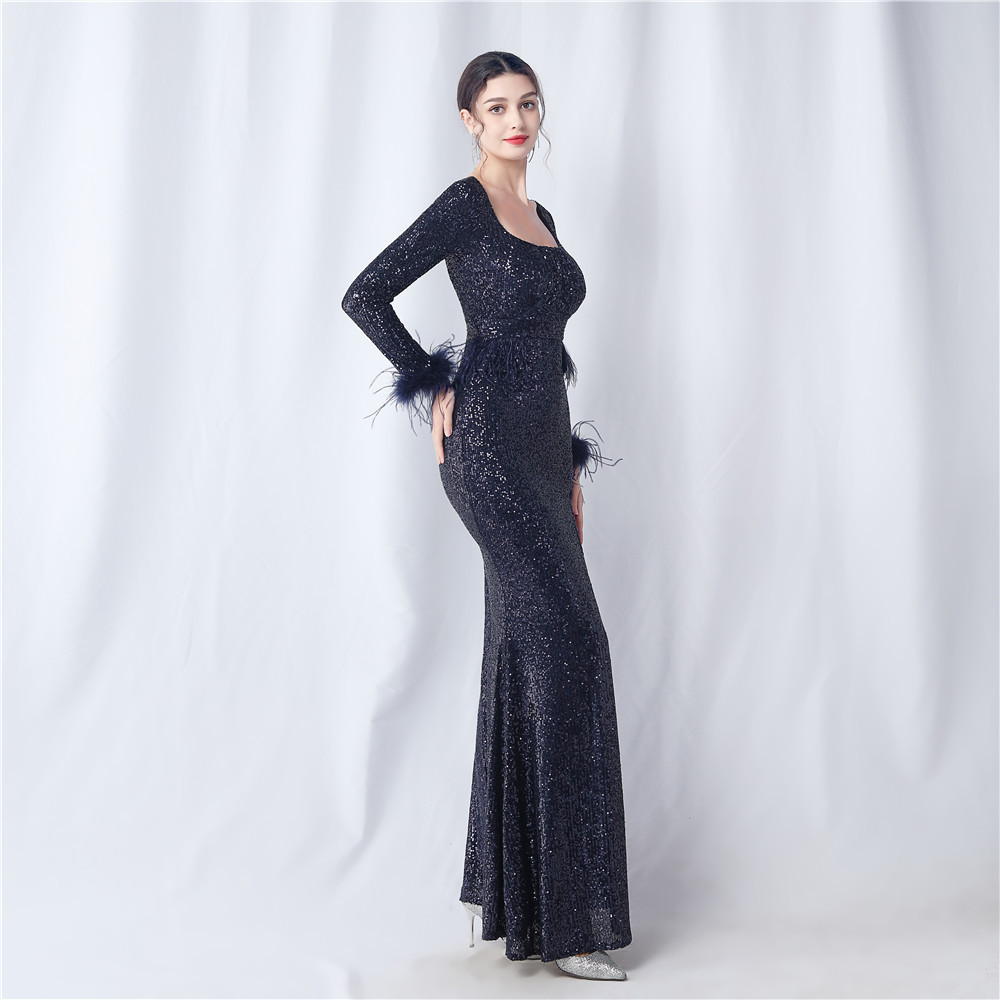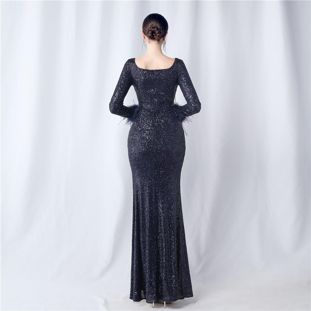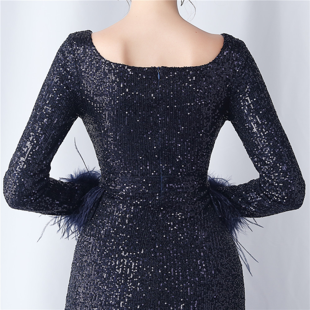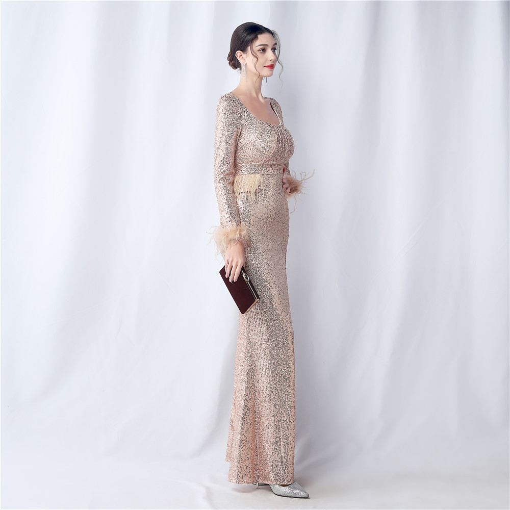 Craft Order Ostrich Feather Dinner Wedding Host Sequin Long Sleeve Evening Dress