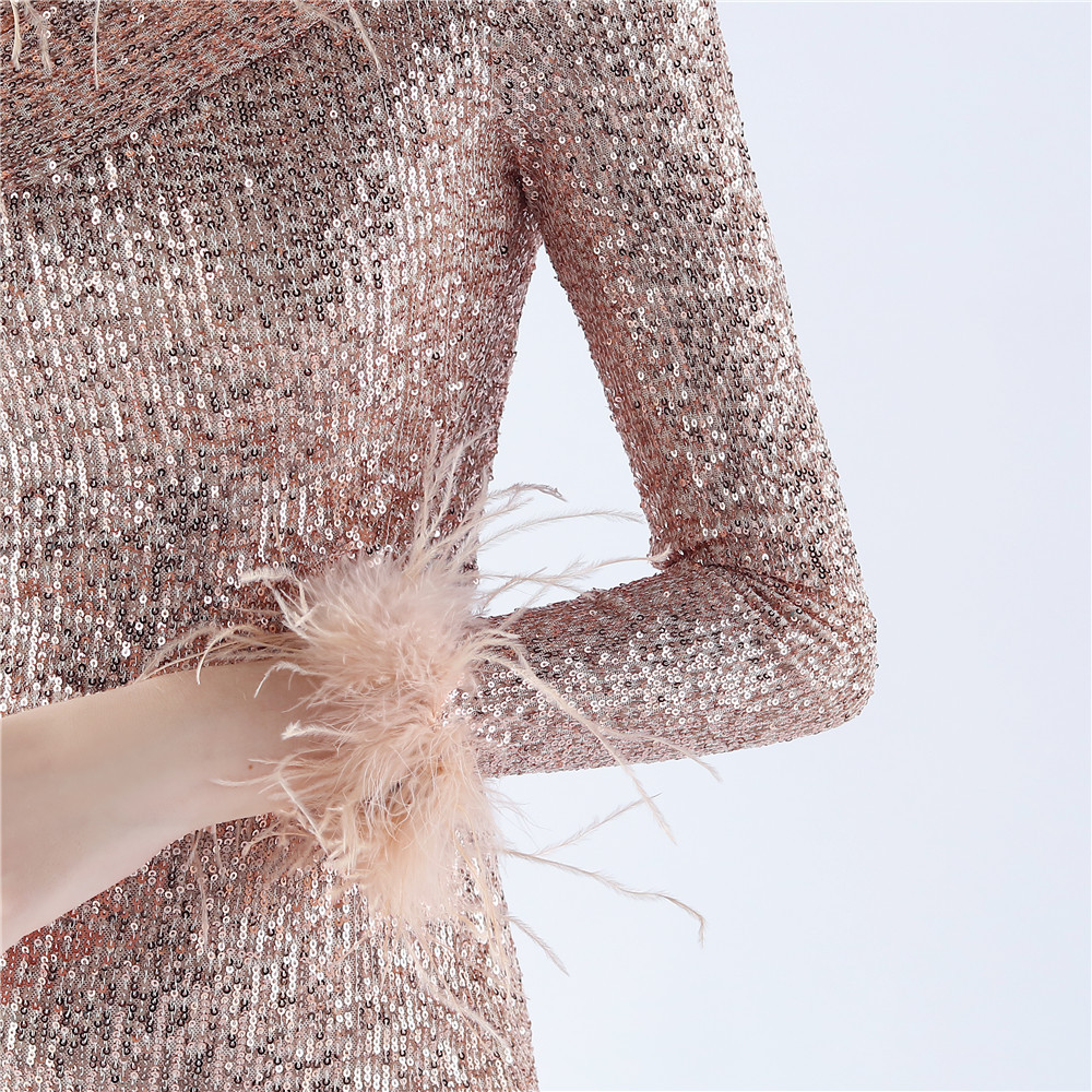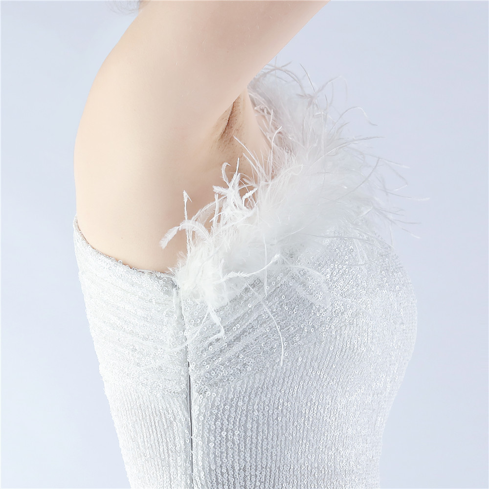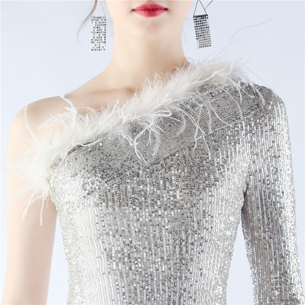 Craft Order Ostrich Feather One Shoulder Diagonal Collar Long Sleeve Short Dress
