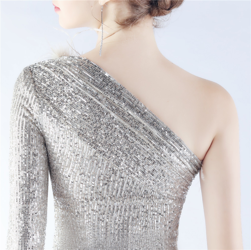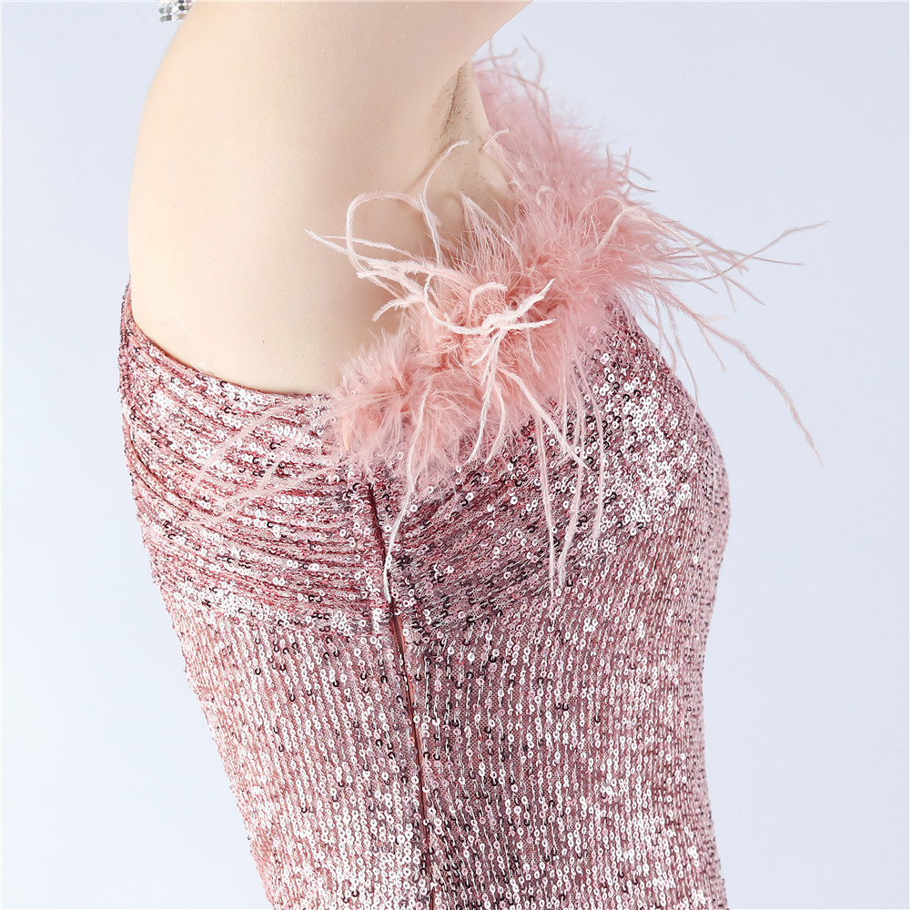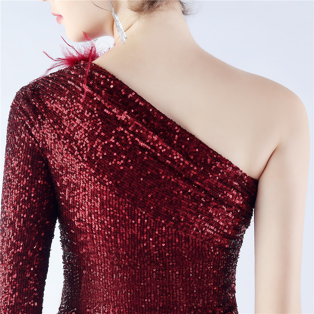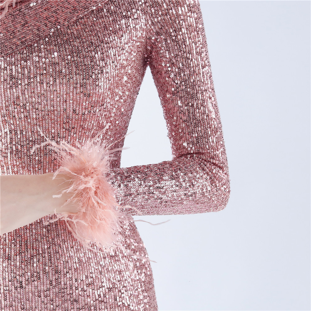 Craft Order Ostrich Feather One Shoulder Diagonal Collar Long Sleeve Short Dress