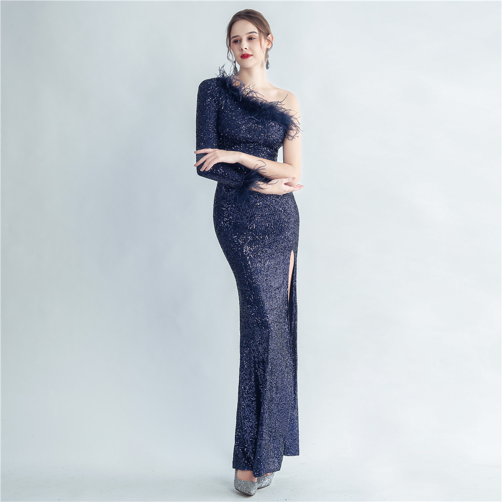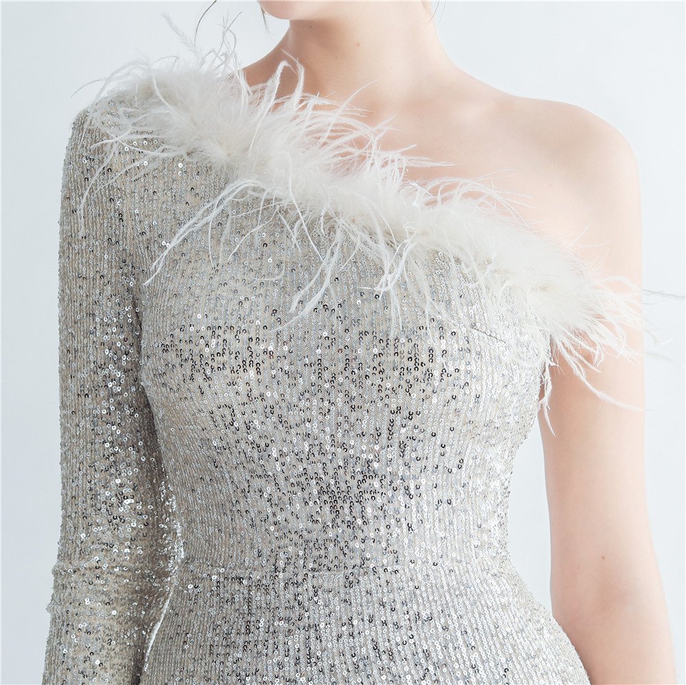 Craft Ostrich Feather Decorative Diagonal Shoulder Roman Collar Side Slit High End Evening Dress