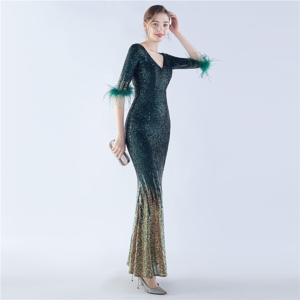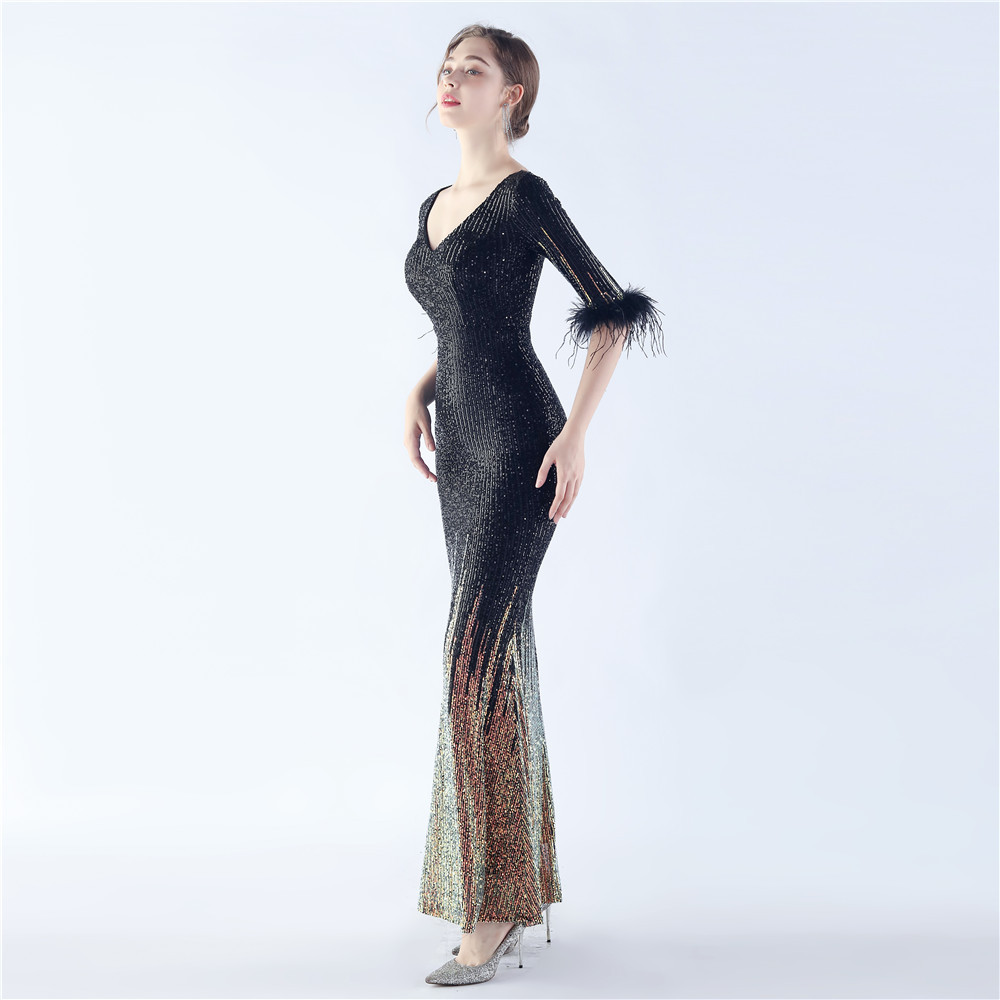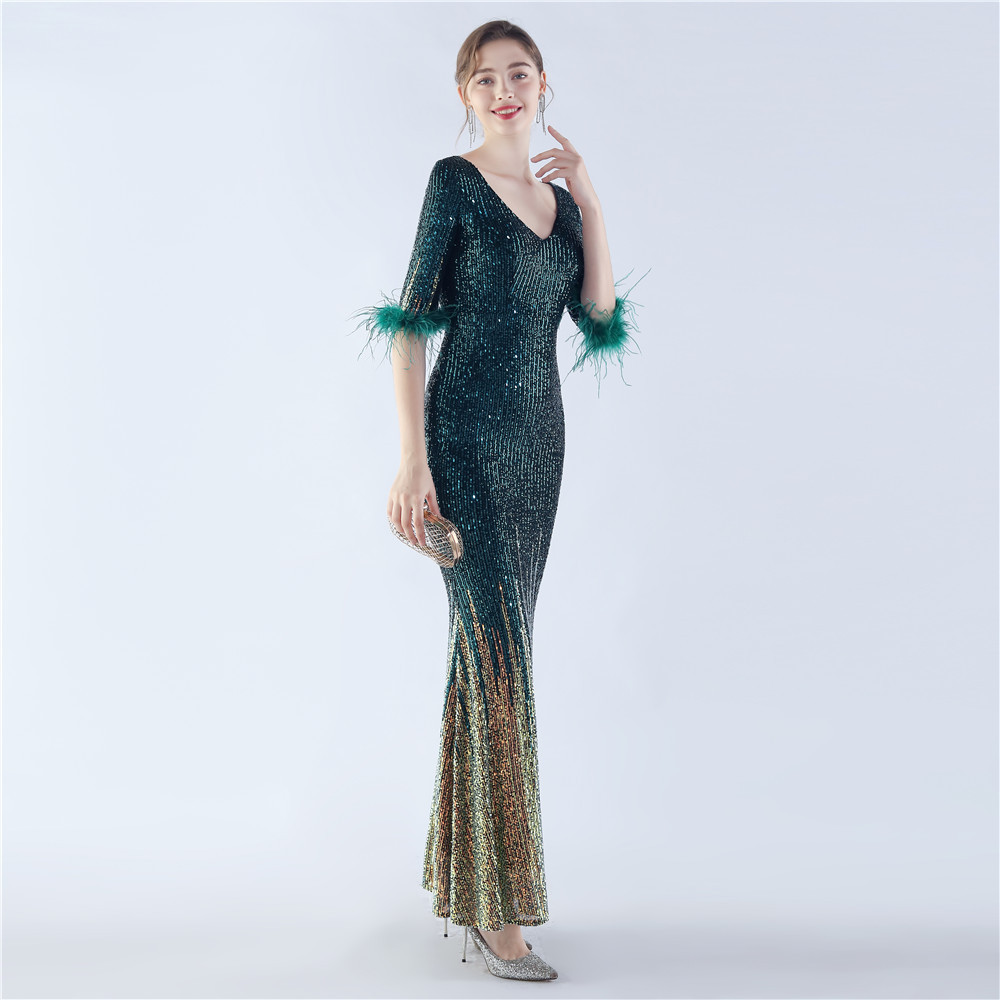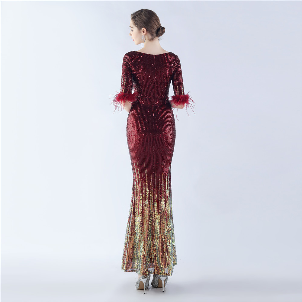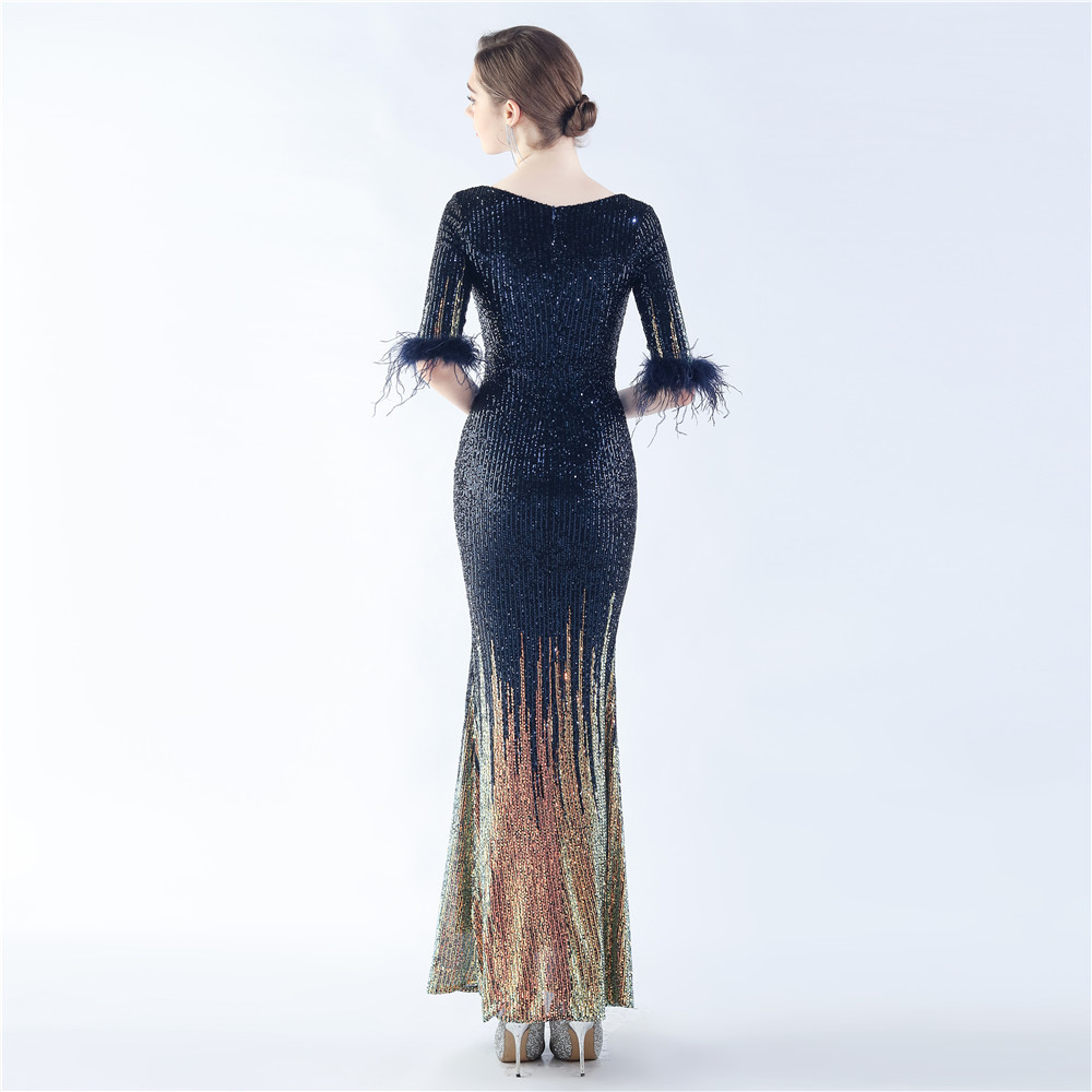 Craft Ostrich Feather Gradient Sequin Half Sleeve High End Evening Dress