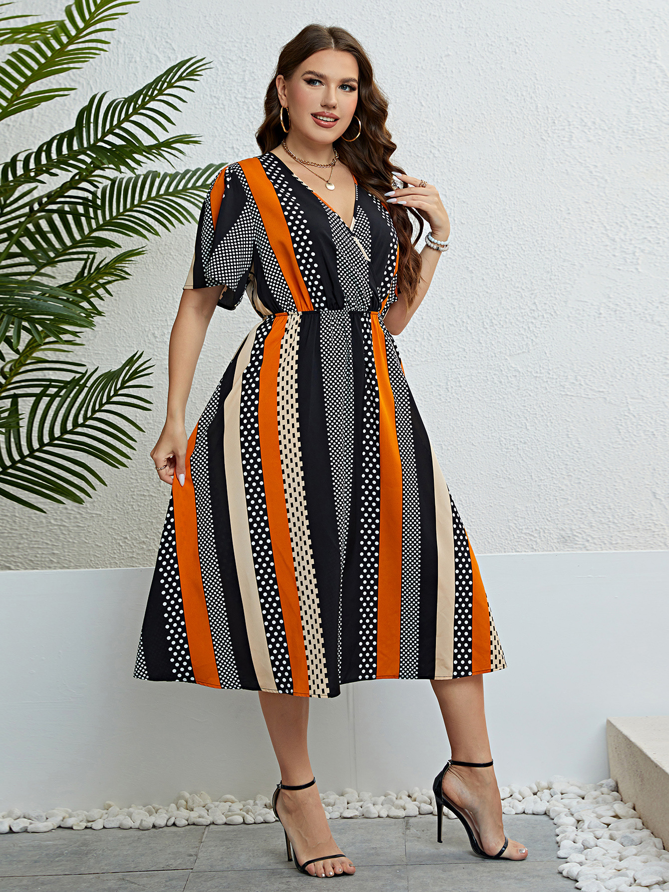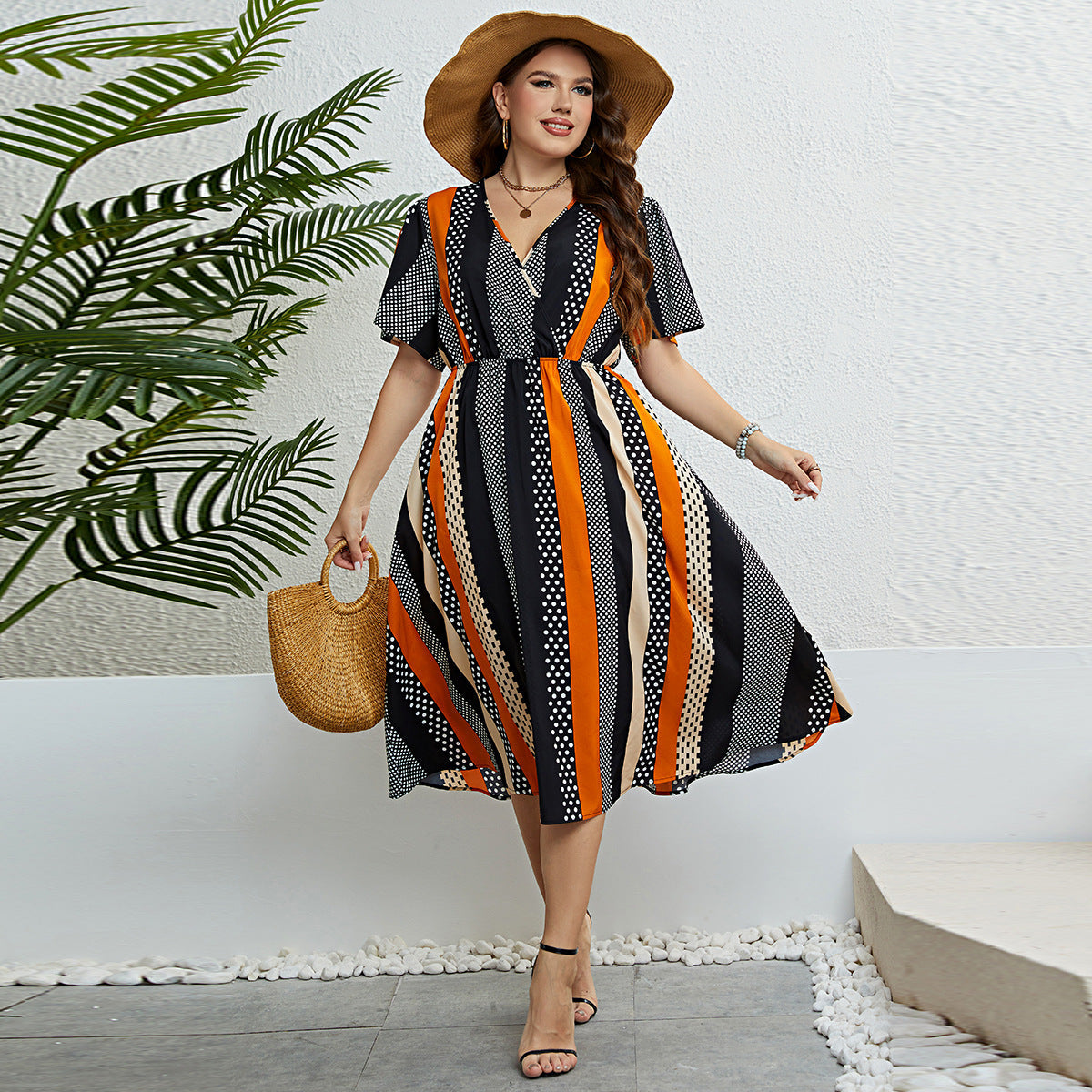 Dress Waist Controlled V neck Printing Dress
