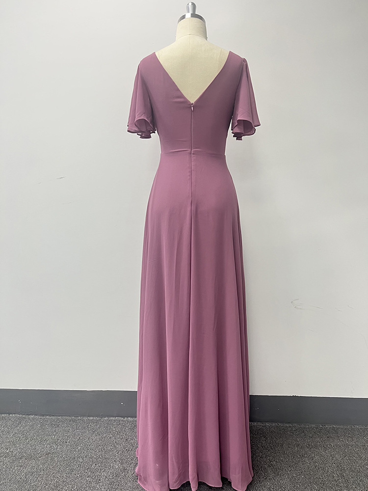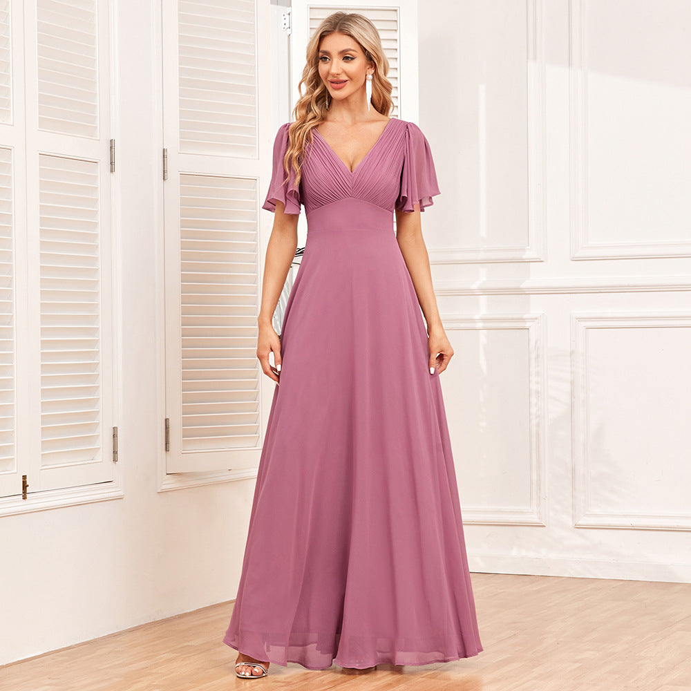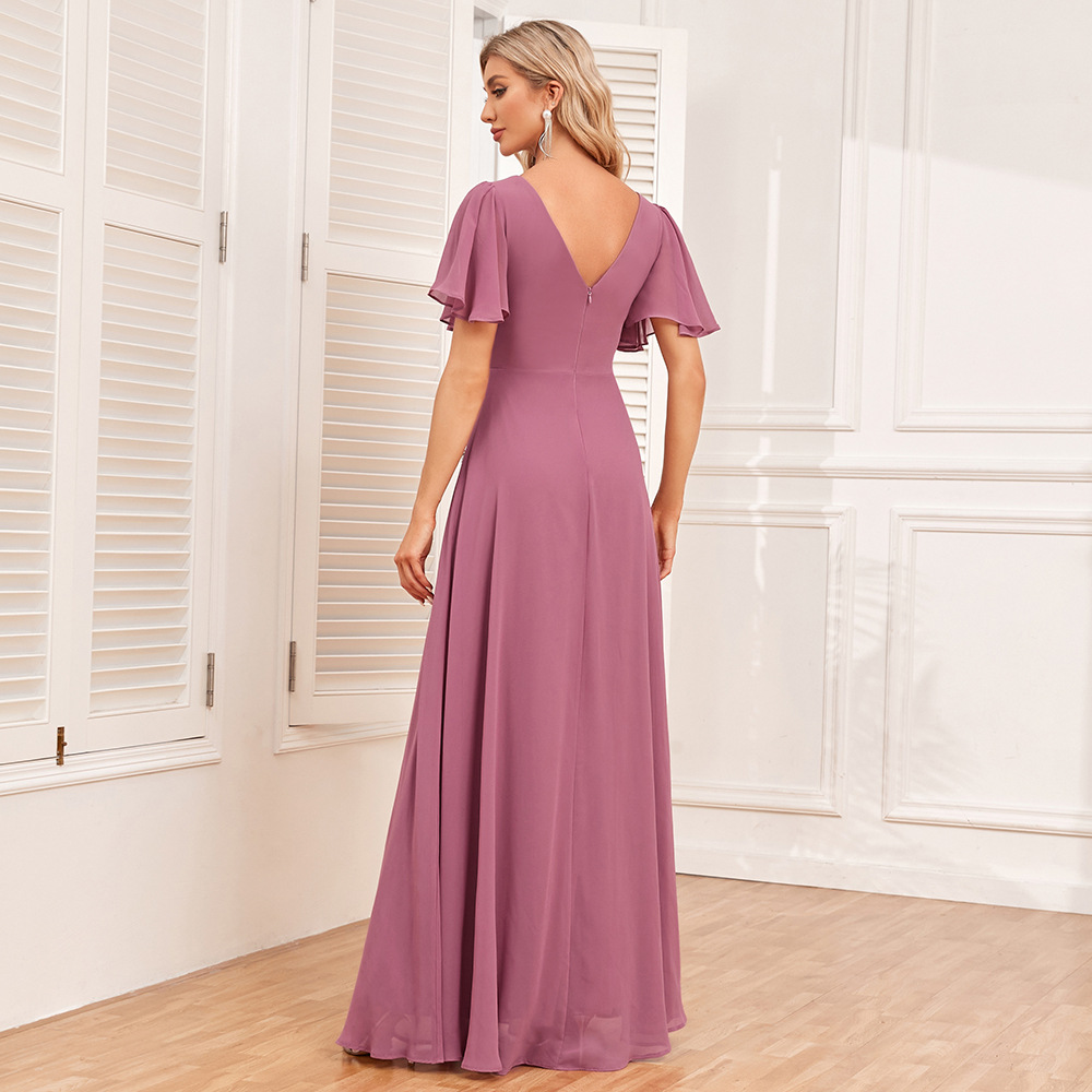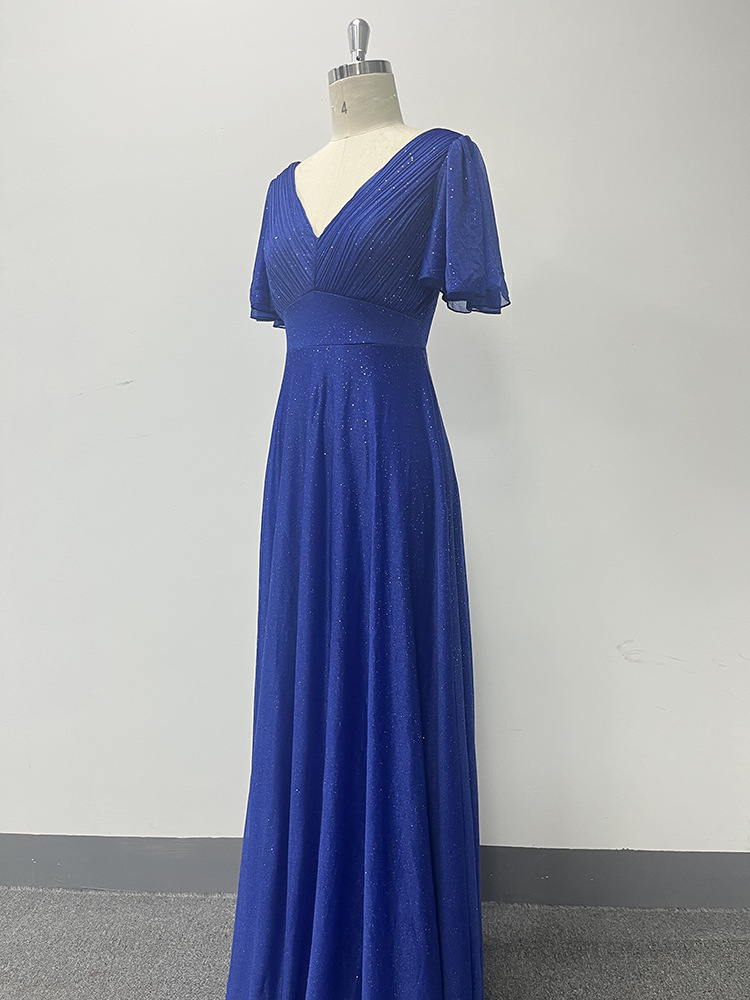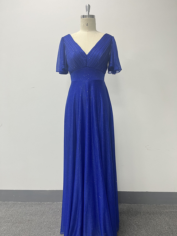 Elegant Double V neck Short Sleeve Shiny Bright Formal Dress A line Fully Lined Chiffon Dress