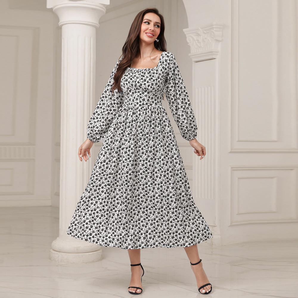 Elegant Party Casual Square Collar High Waist Floral Dress