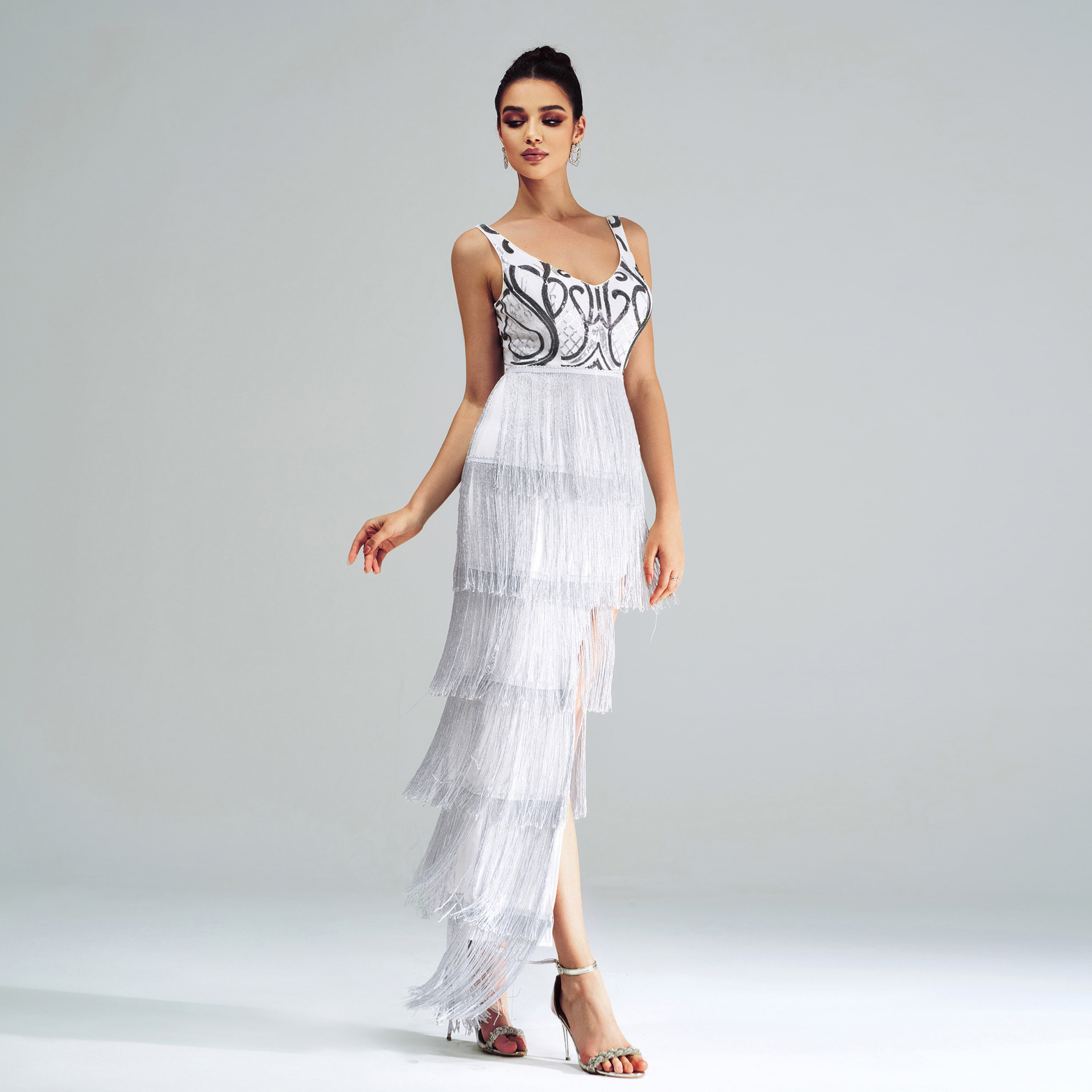 Elegant Sleeveless V neck Cocktail Sheath Sequined Tassel Split Evening Dress