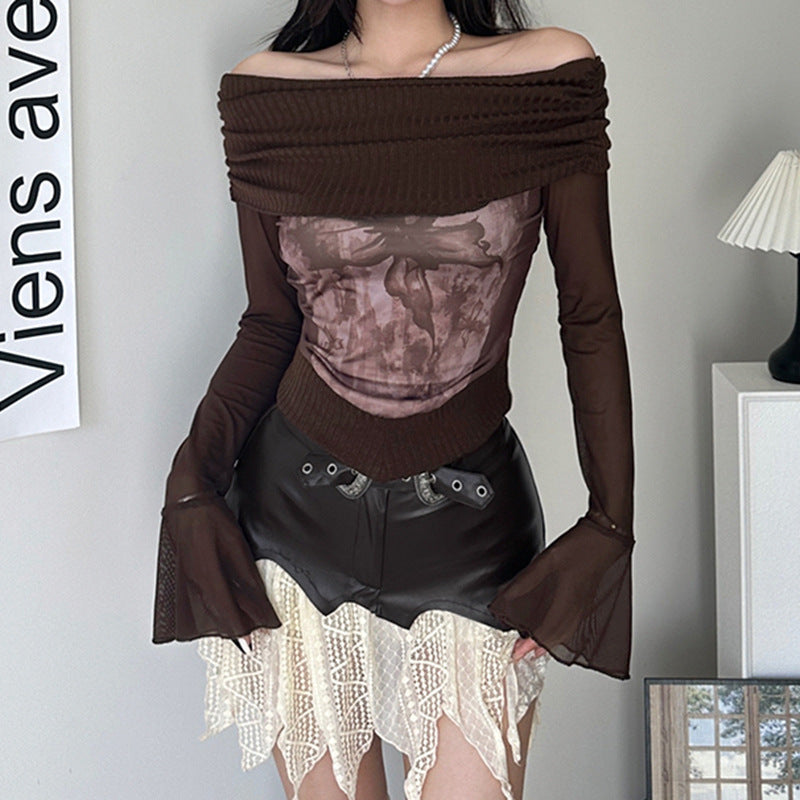 Der transparente Stoff besticht durch einen abstrakten, erdigen Druck. Perfekt für ein mehrlagiges, strukturiertes Outfit. Mit langen Ärmeln und gerüschter Vorderseite betont dieses Top Ihre Silhouette und bietet gleichzeitig eine entspannte Passform. Ideal zu High-Waist-Jeans oder einem Rock. Dieses Top ist ein Must-have für alle, die Grunge-Ästhetik mit Fairycore-Charme kombinieren möchten.