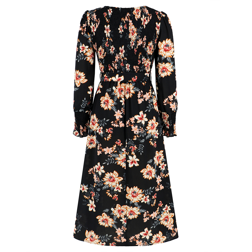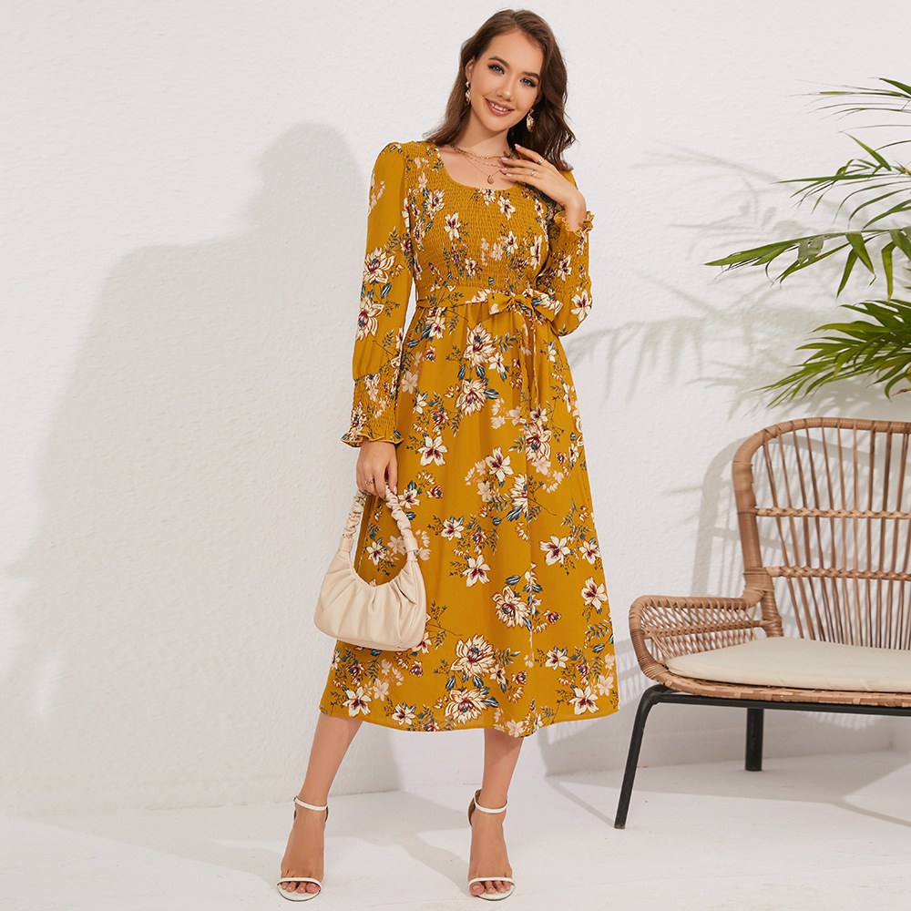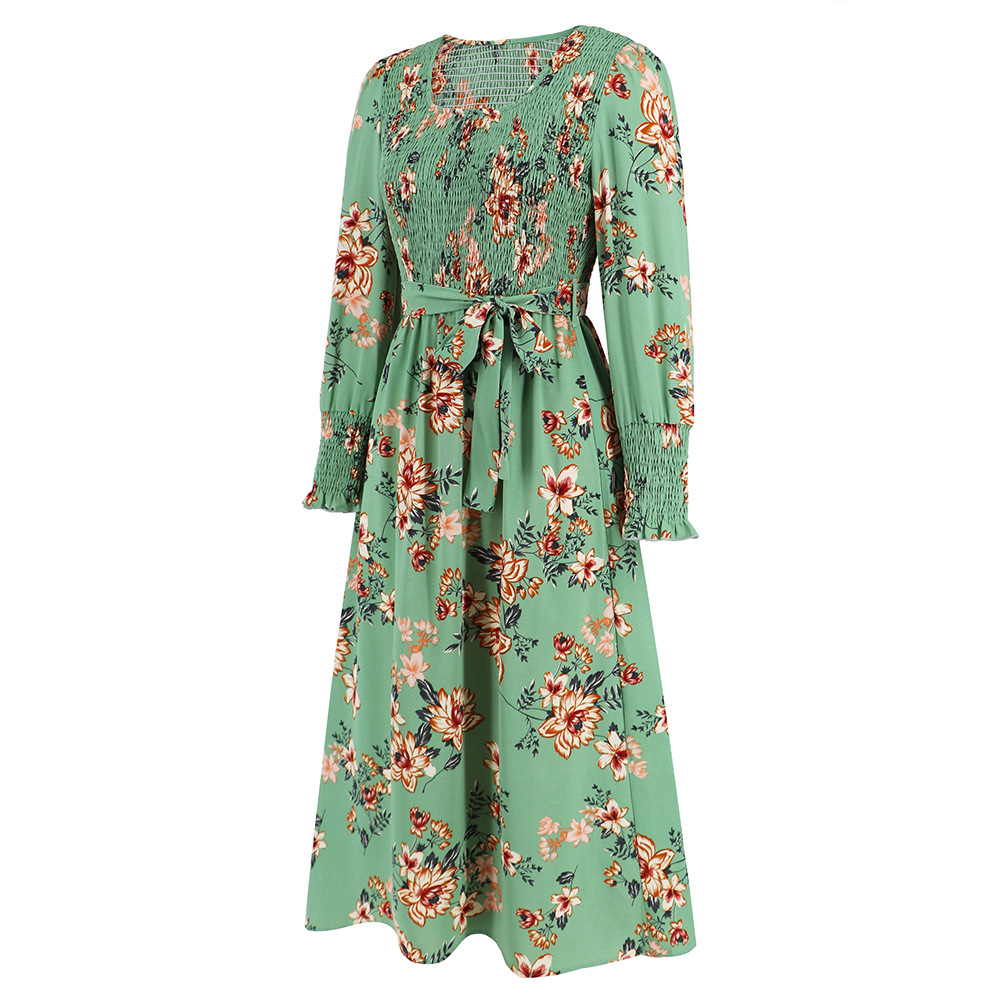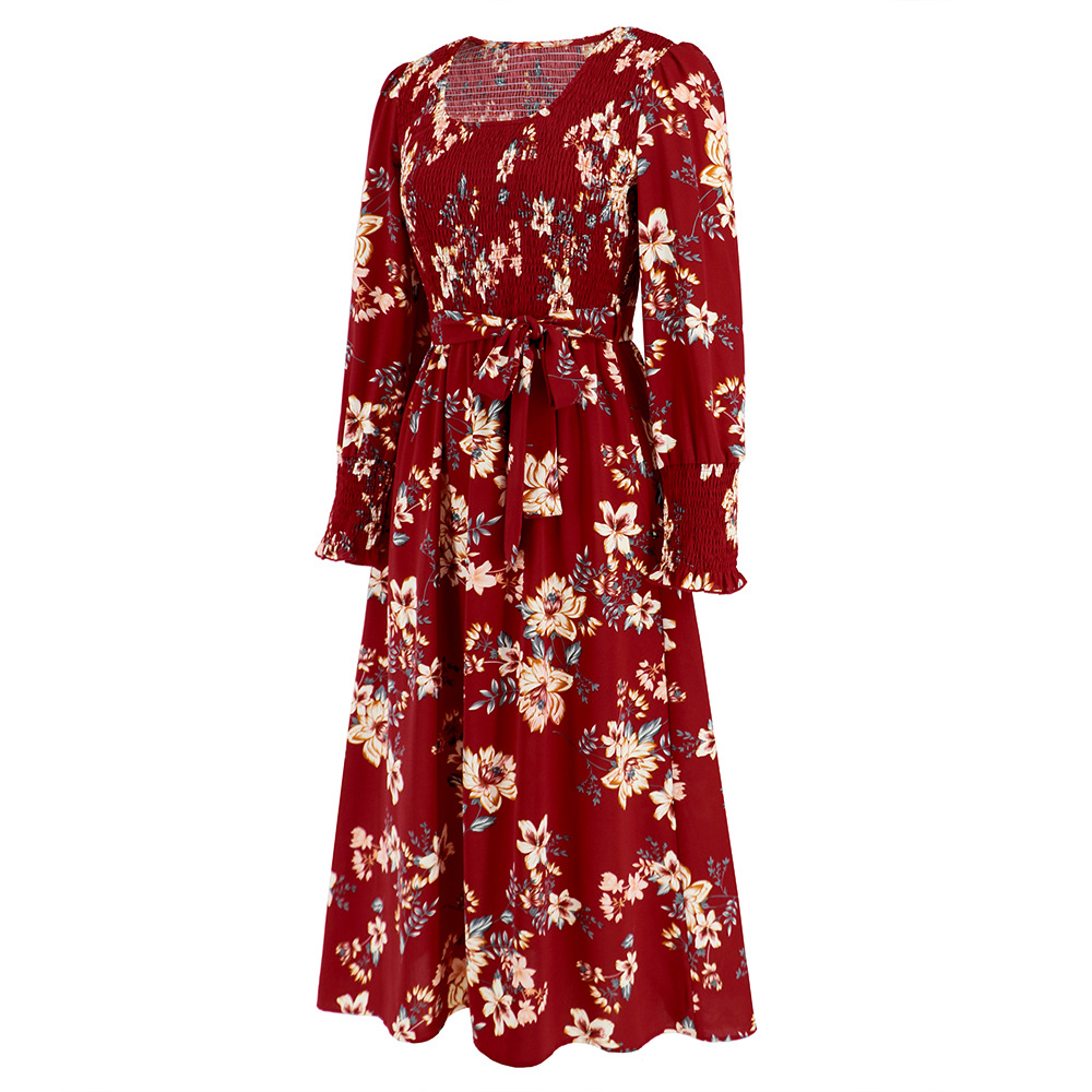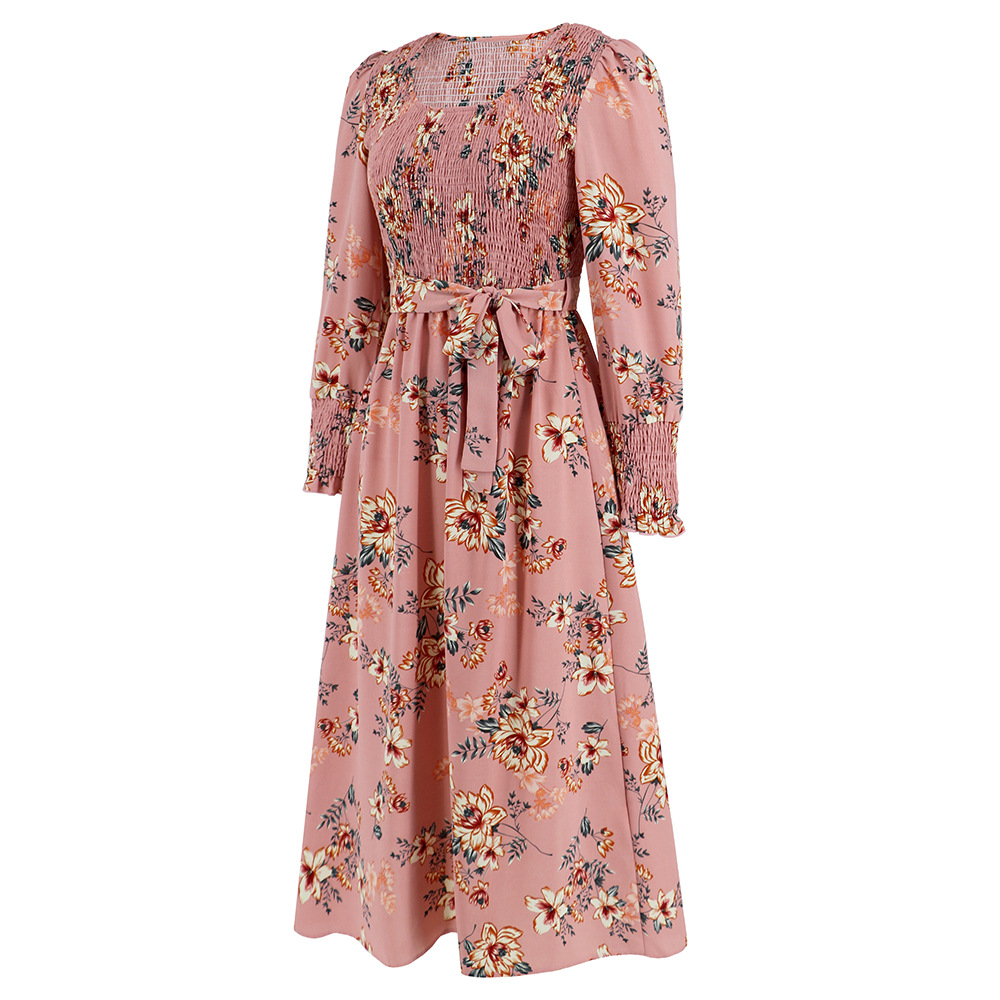 Fall Retro Long Sleeve Smocking Floral Mid Length round Neck Dress Popular