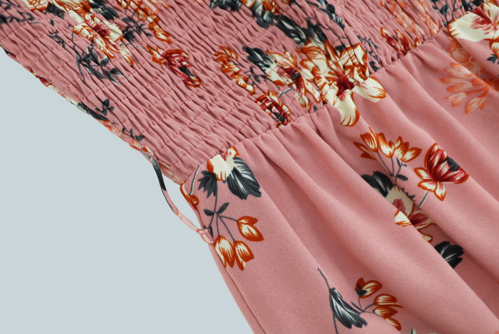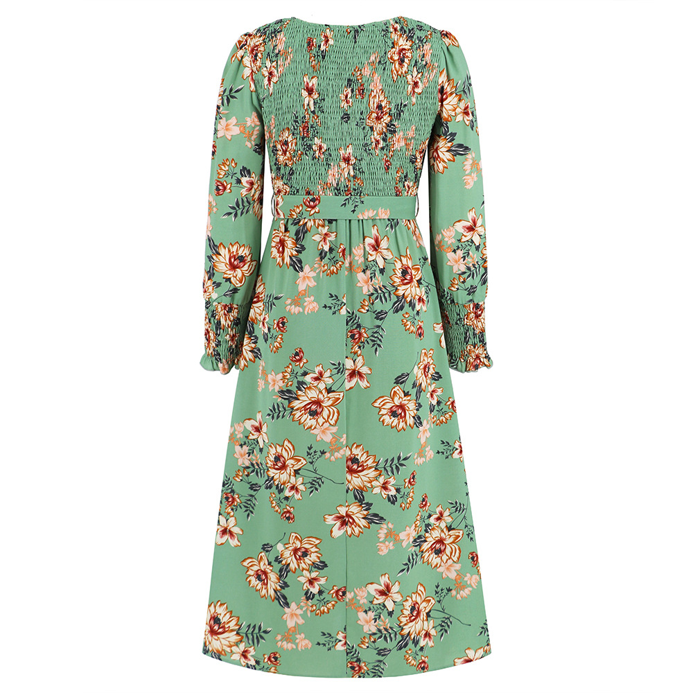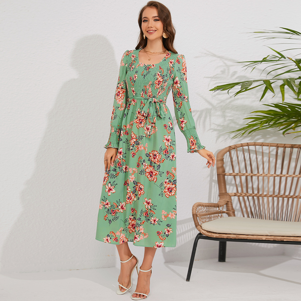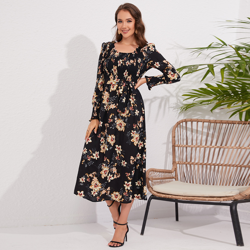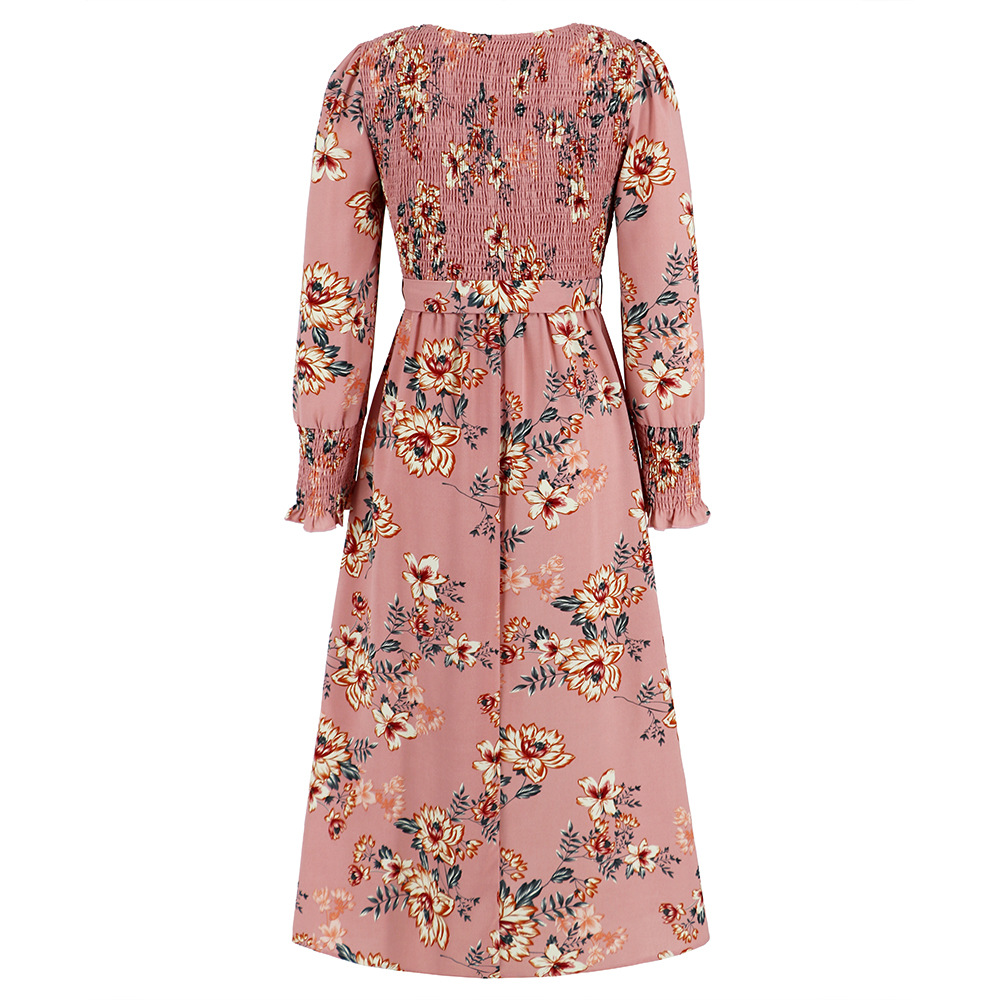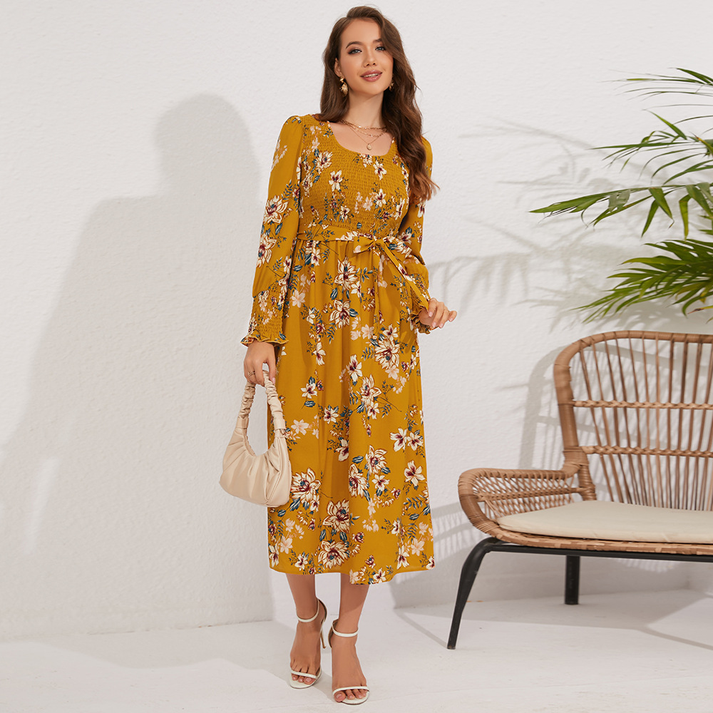 Fall Retro Long Sleeve Smocking Floral Mid Length round Neck Dress Popular