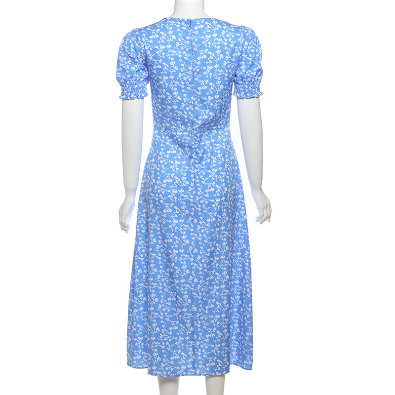 French Floral Slim Fitting Slimming Square Collar Split Short Sleeve Dress