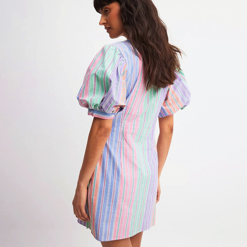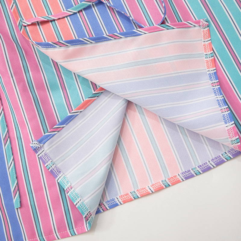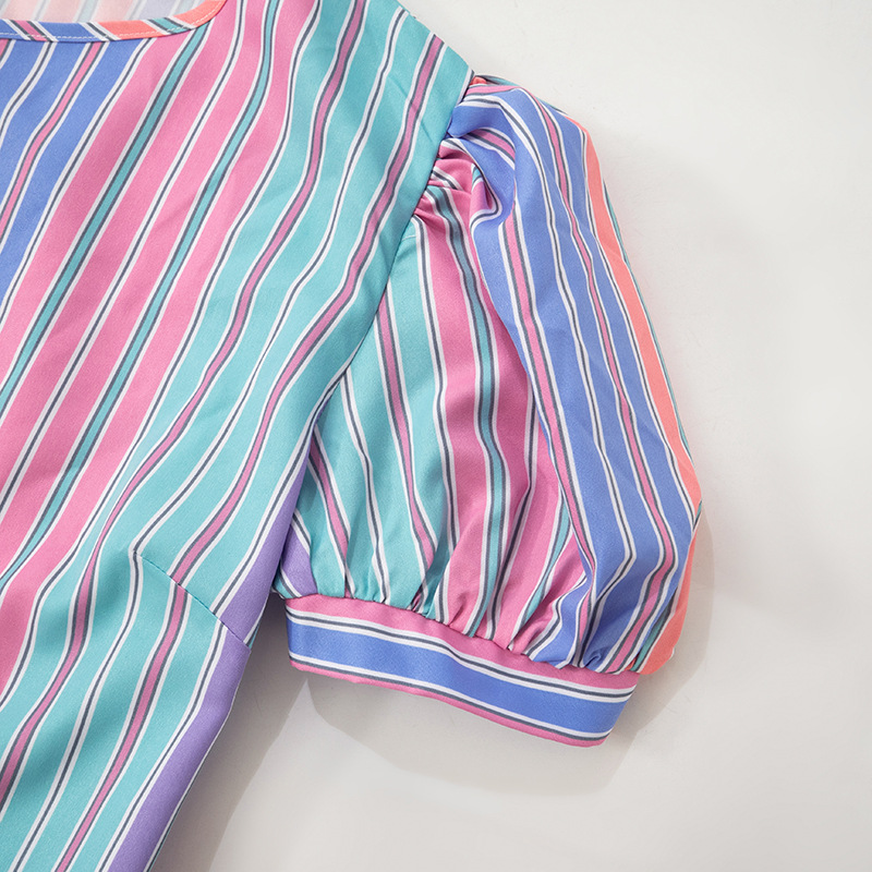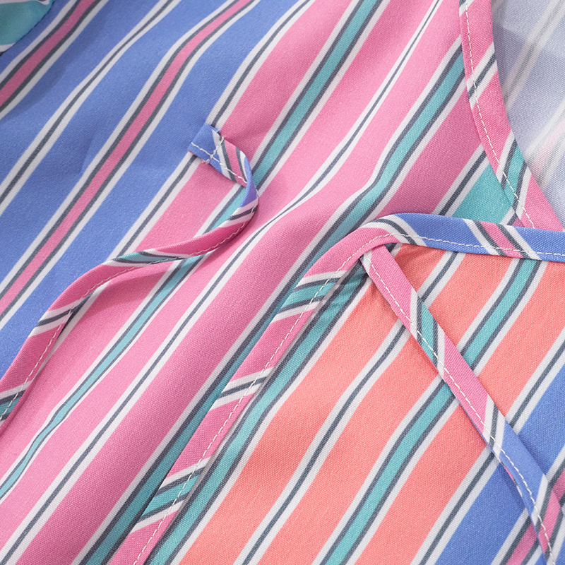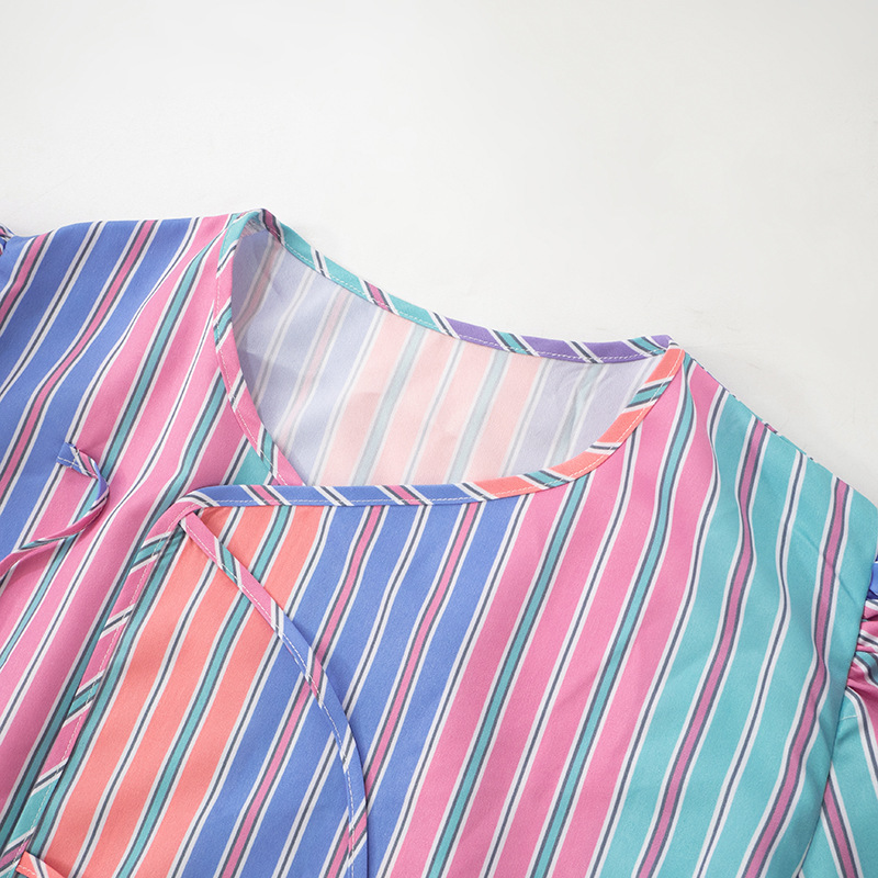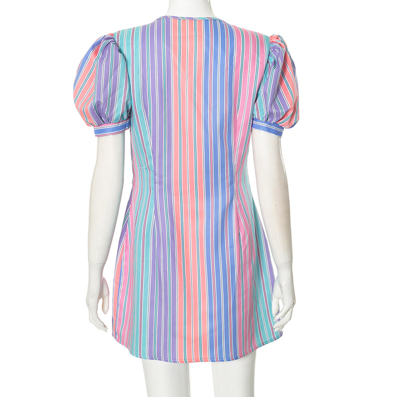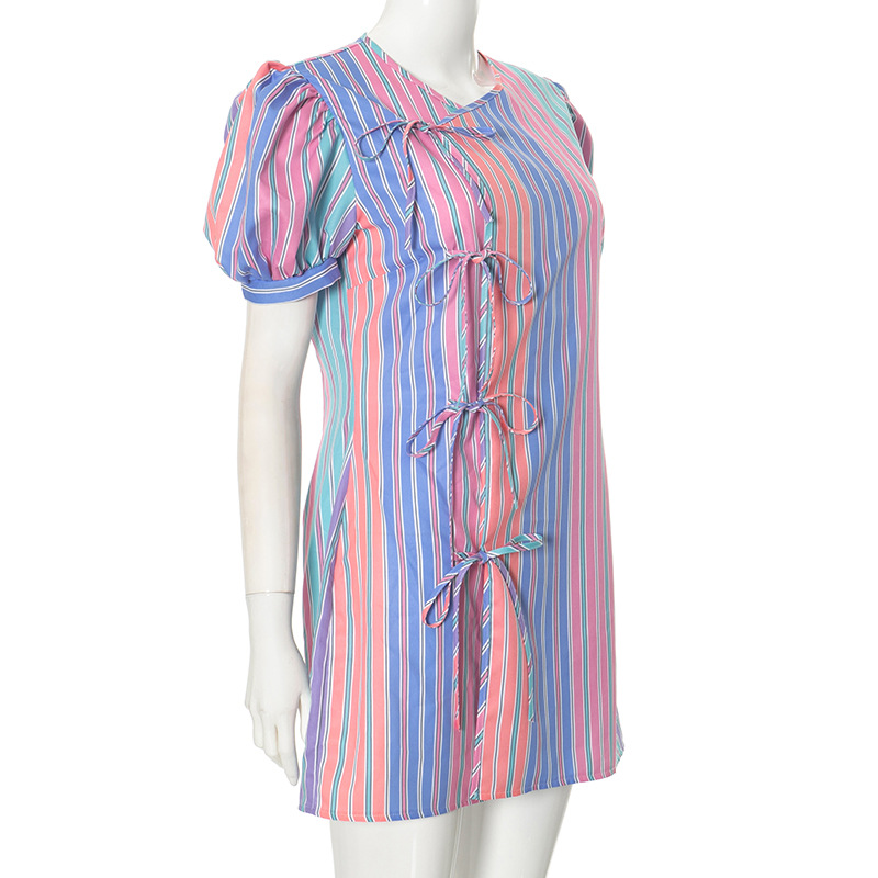 Fresh Casual V Neck Striped Printed Puff Sleeves Irregular Asymmetric Lace Up Dress