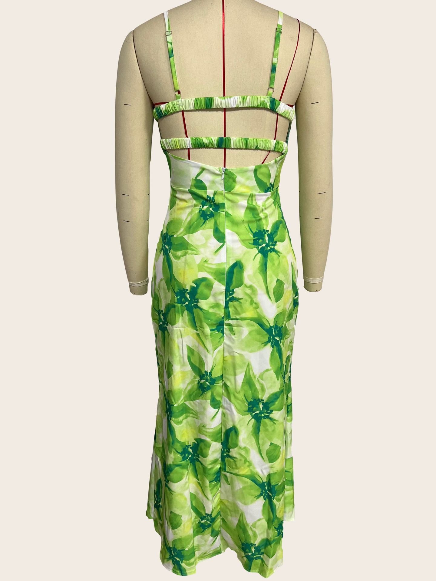 Fresh Sweet Floral Print Backless Mid Length Dress
