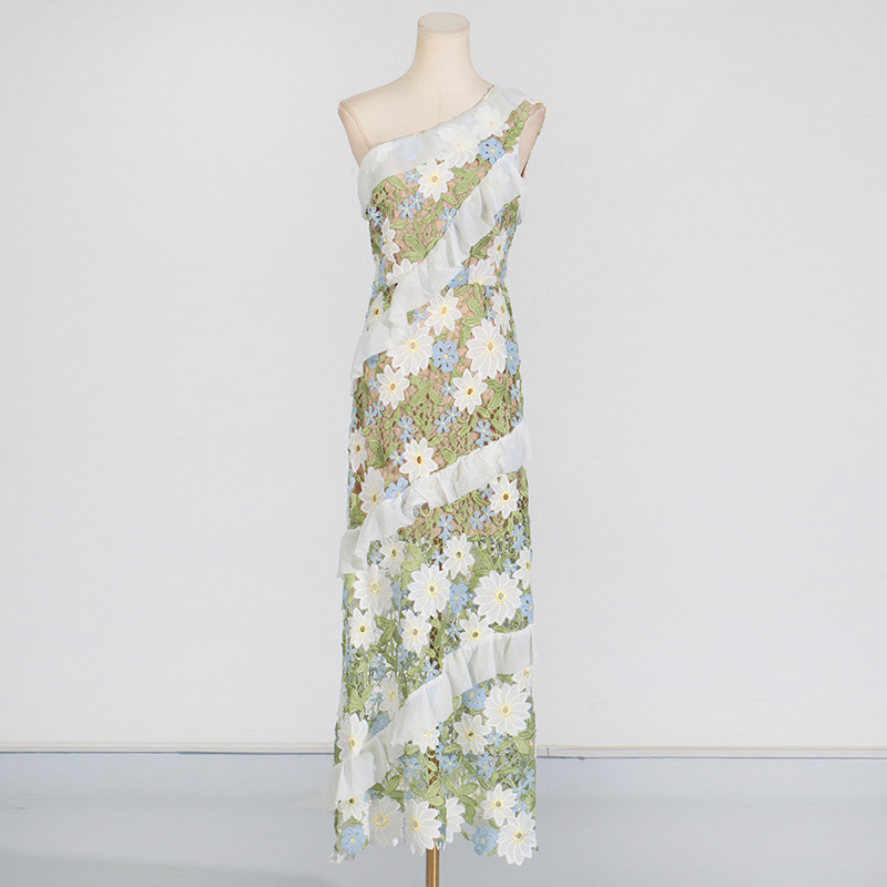 Fashionable Fresh Sweet Shoulder Sleeveless Water Soluble Floral Embroidered Mesh Stringy Selvedge Dress