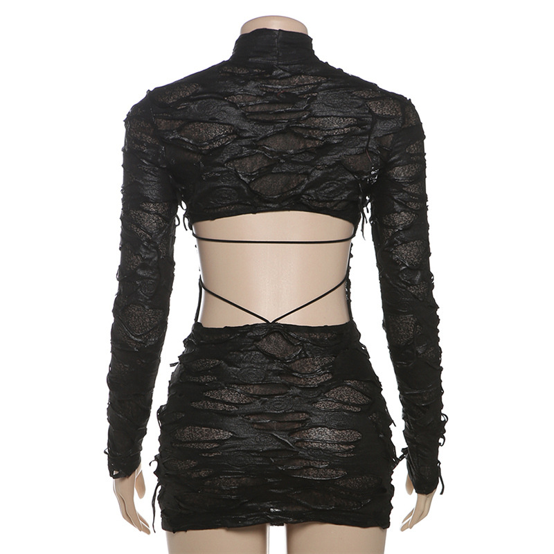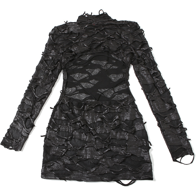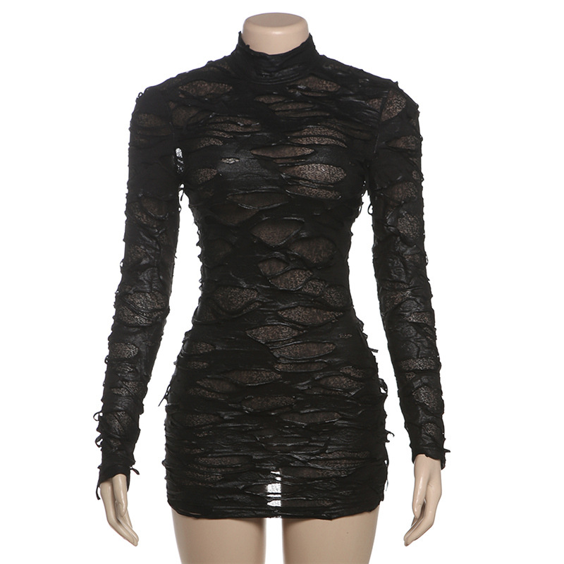 Half High Collar Long Sleeves Hollow Out Cutout-out Semi Transparent Design Hip Dress
