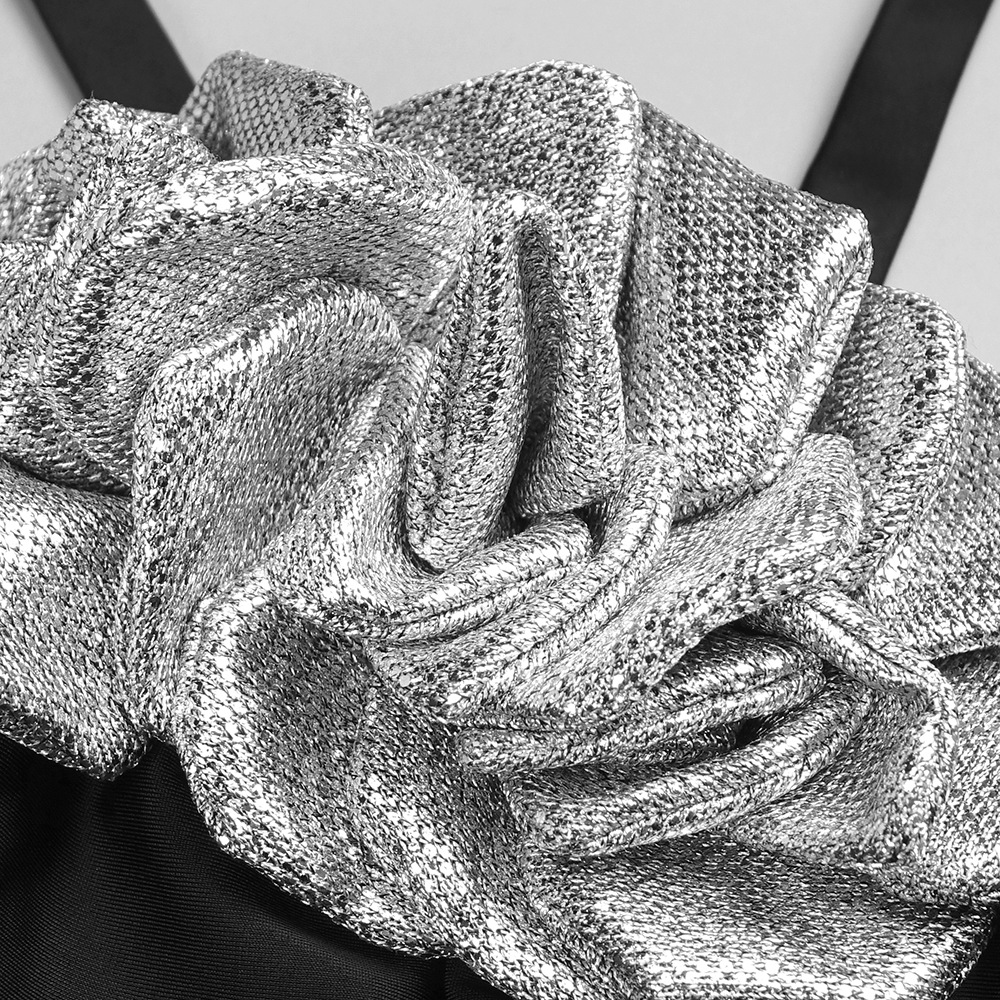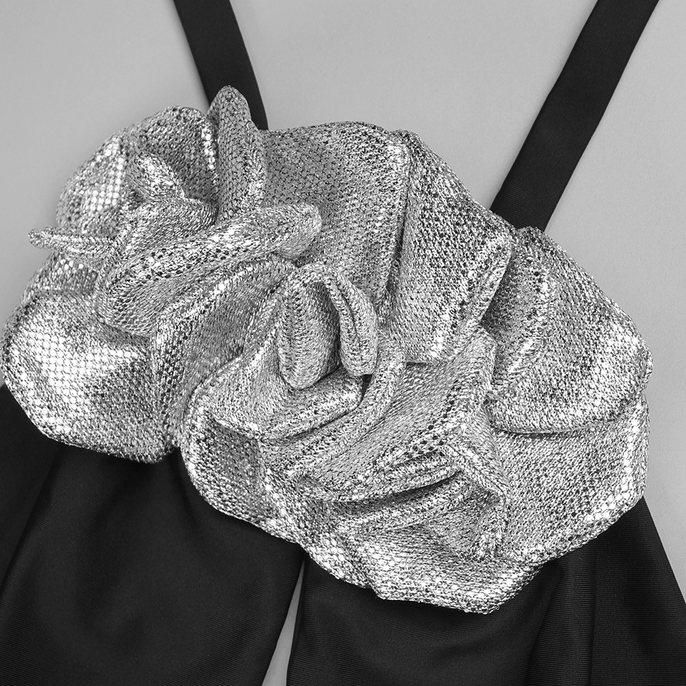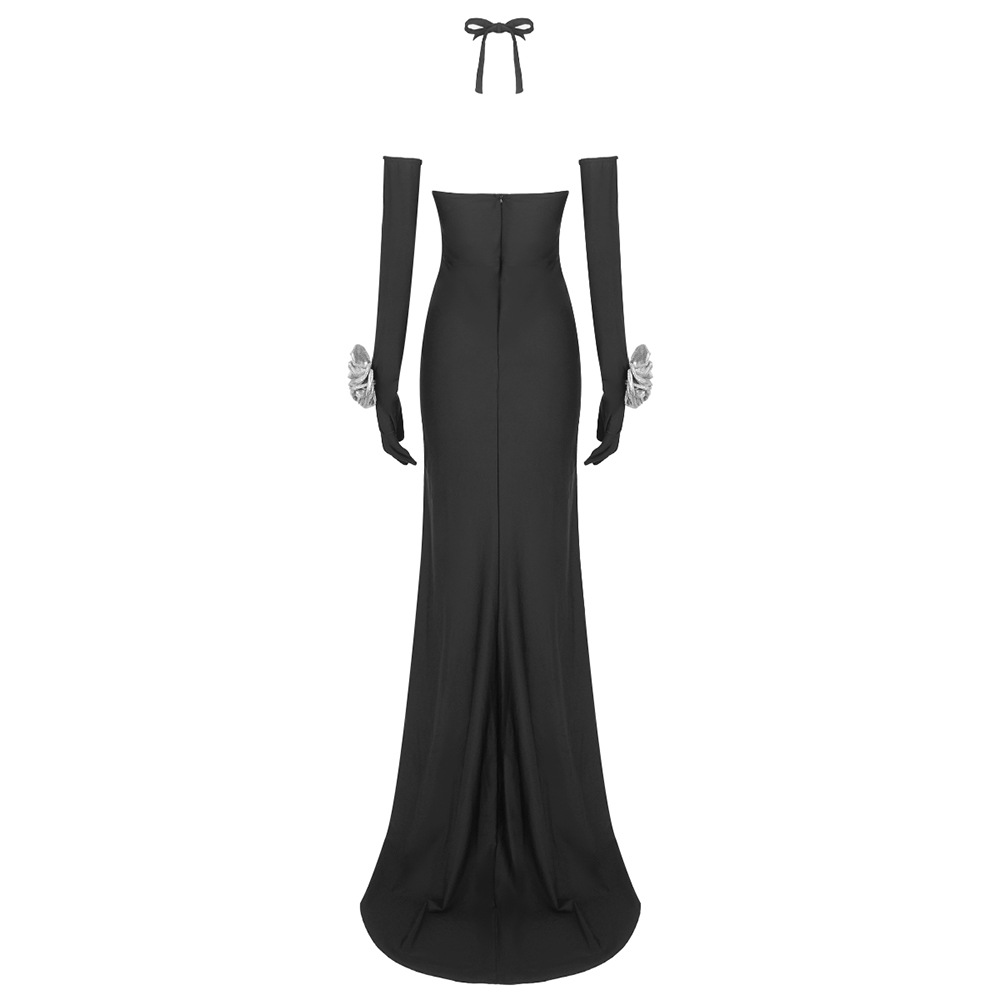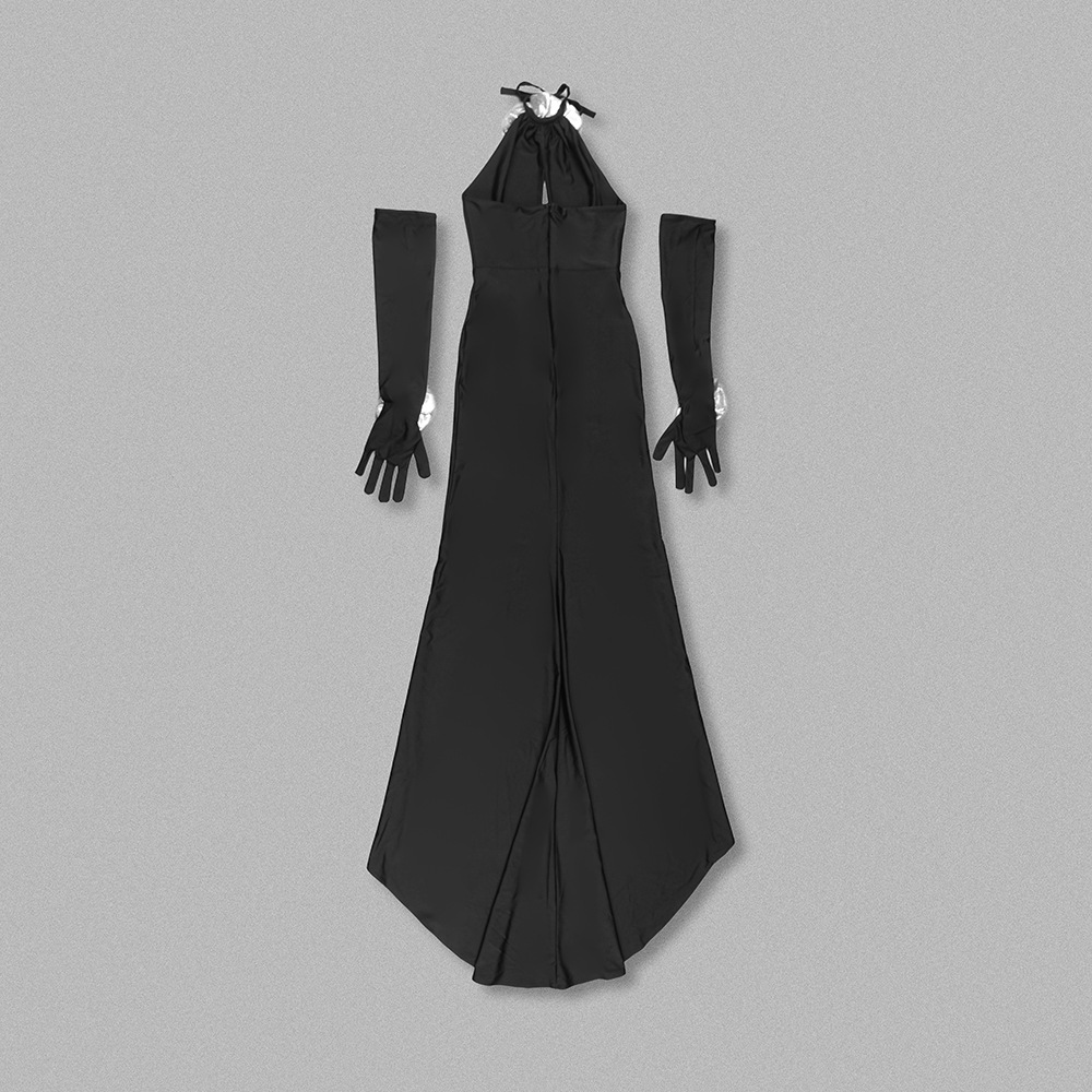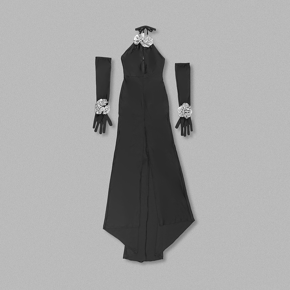 Halter Silver Floral Hollow Out Cutout Dress with Gloves Split