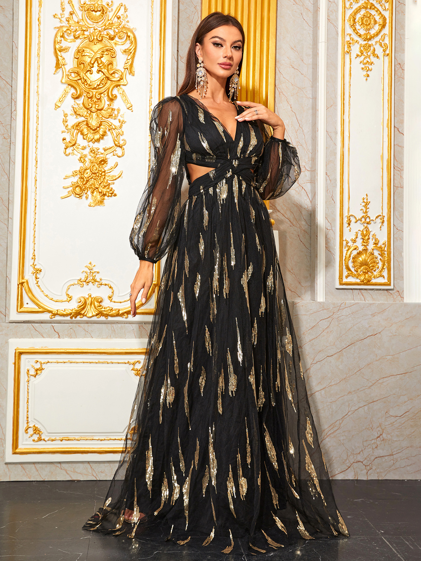 High Class Prom Evening Dress Sequined Lantern Sleeve V neck Waist Hollow Out Cutout out Elegant Dress