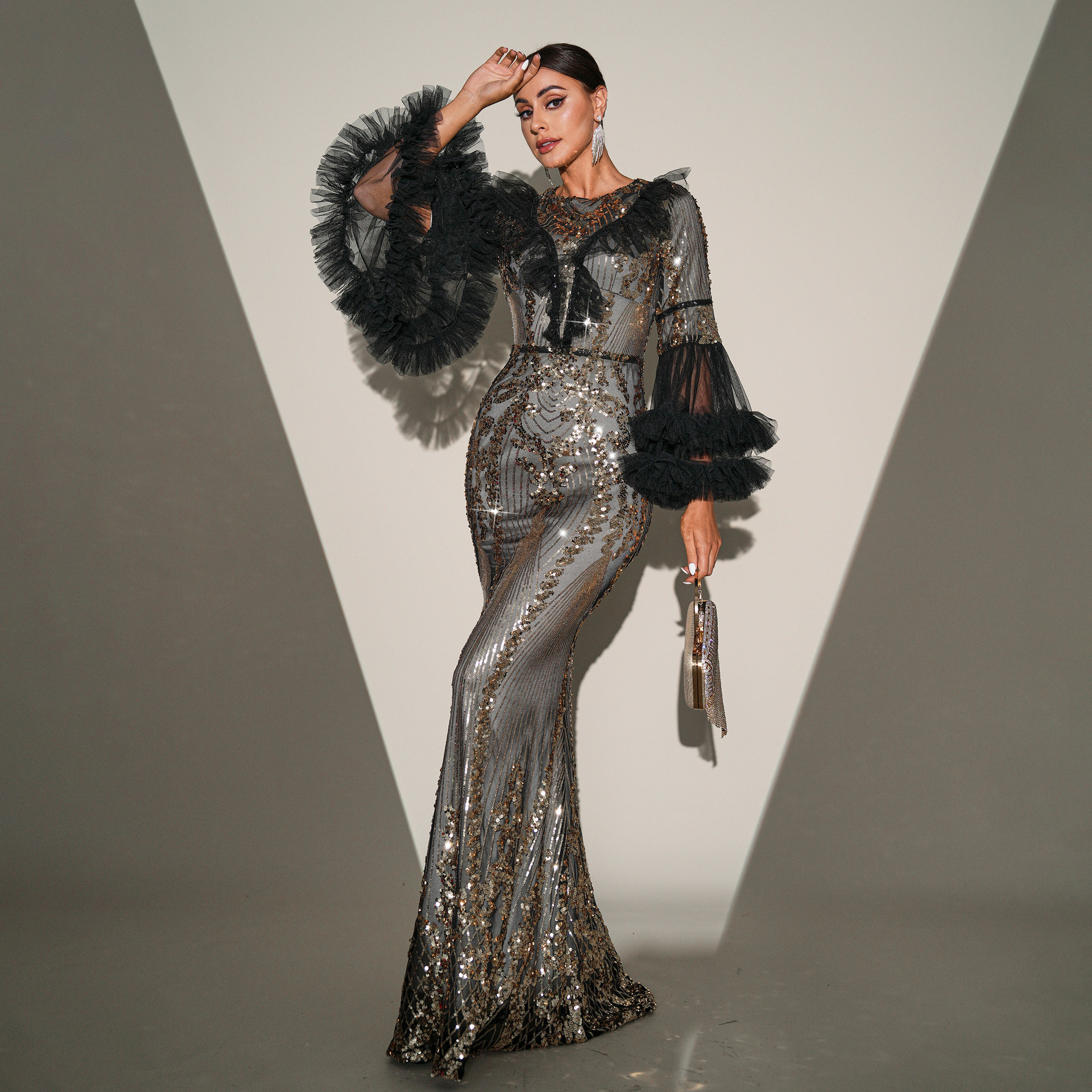 High End Long Sleeve Crew Neck Long Sequined Cocktail Fishtail Evening Dress Bridesmaid Dress
