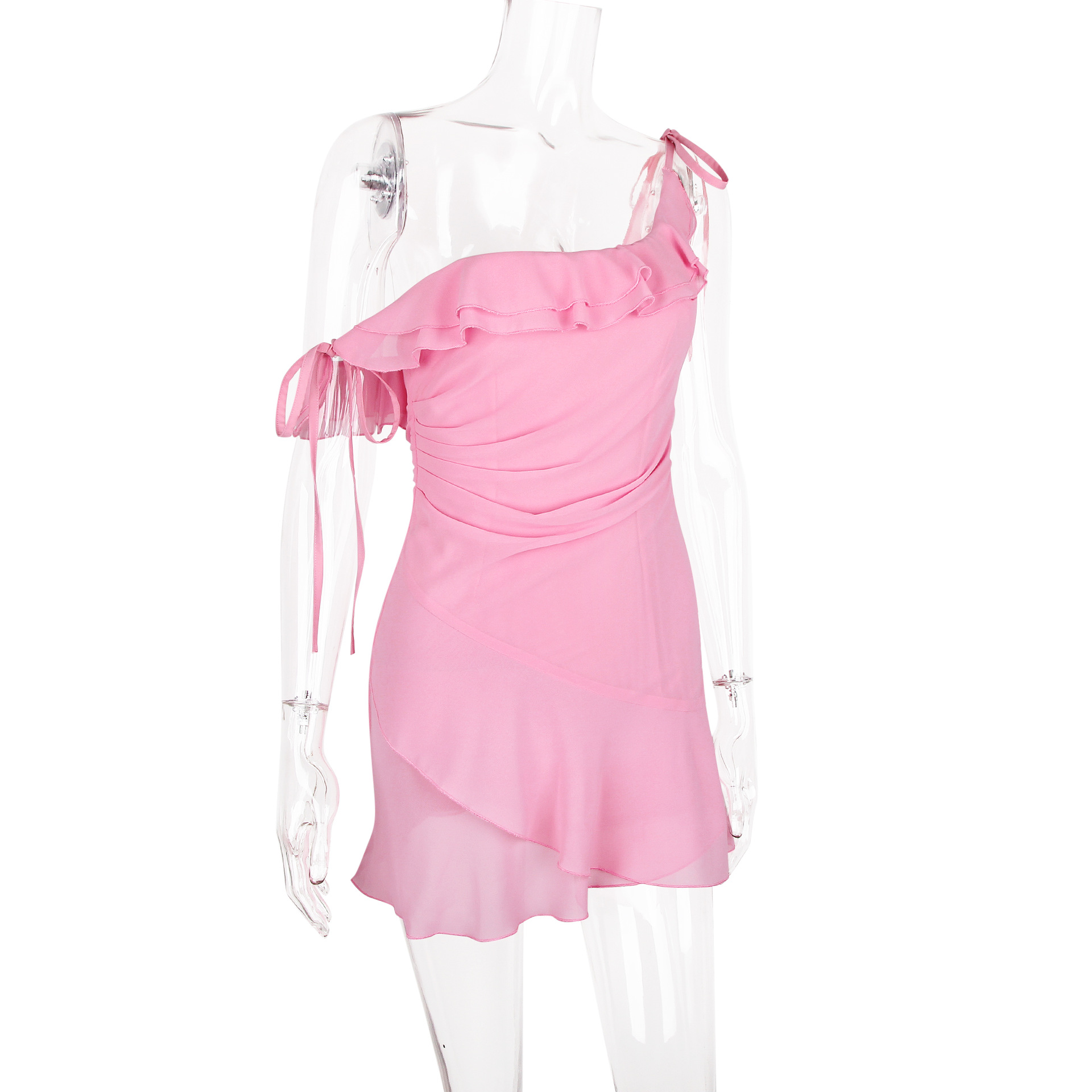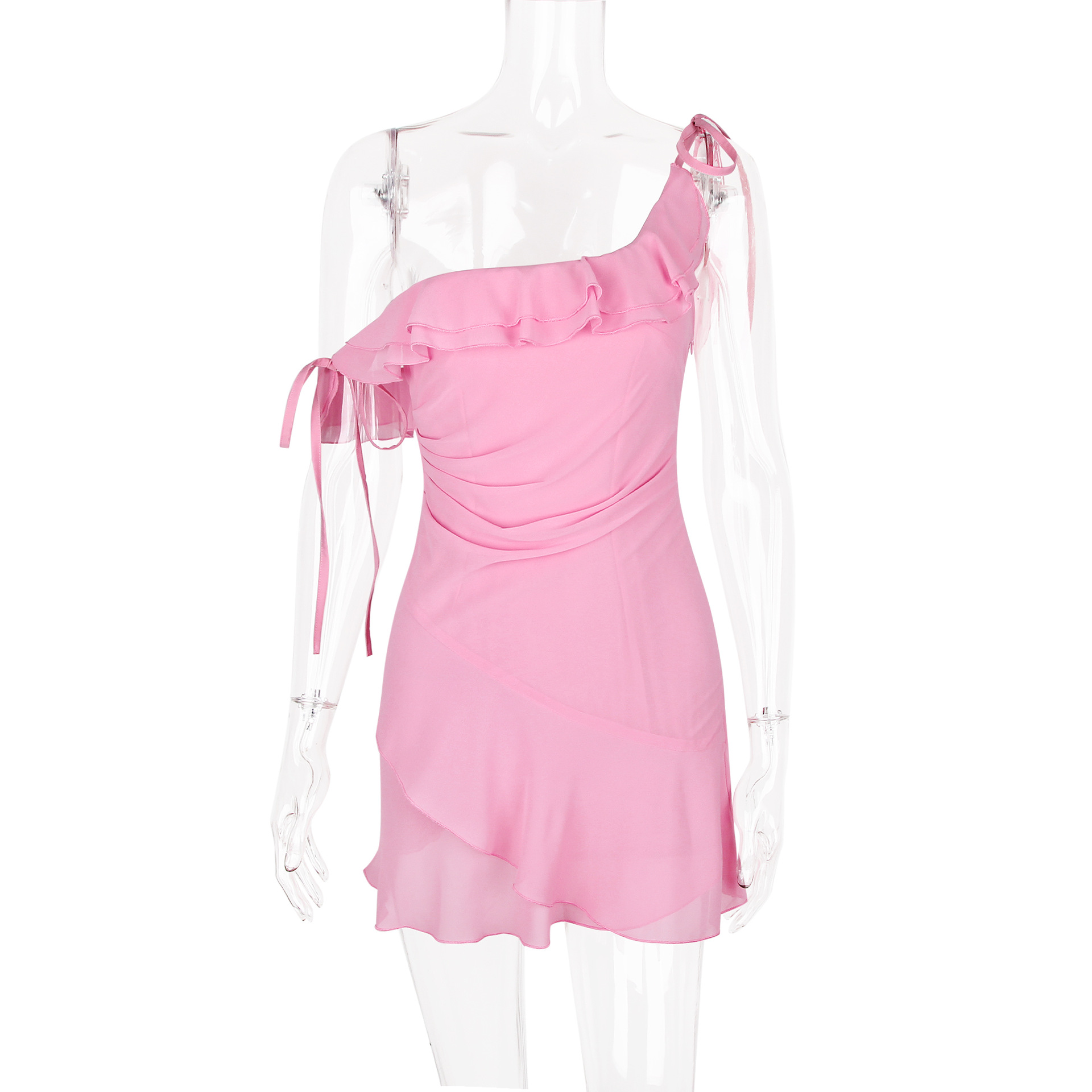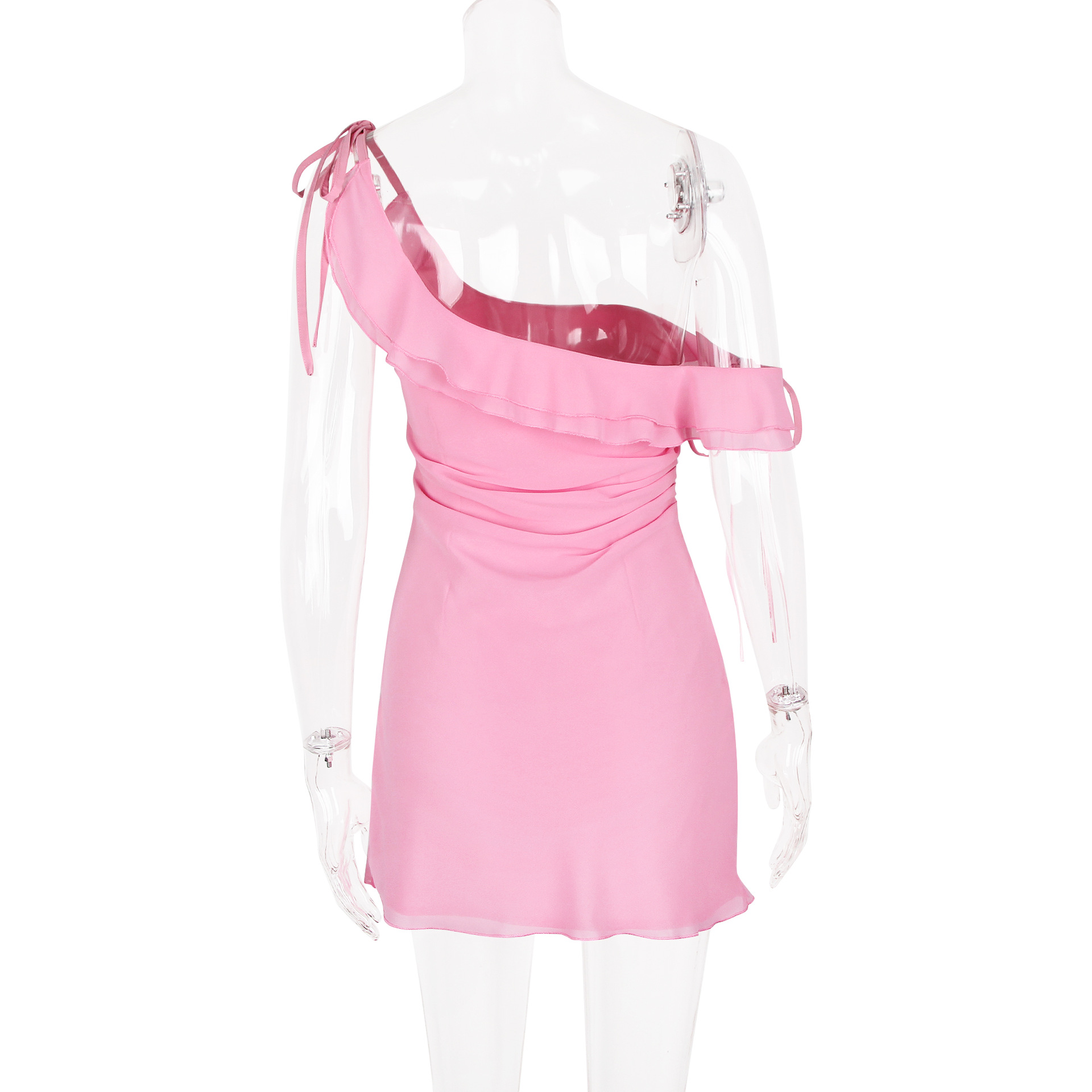 High Grade Chiffon Ruffled Oblique Shoulder French Dress Sweet Spicy Pink Small
