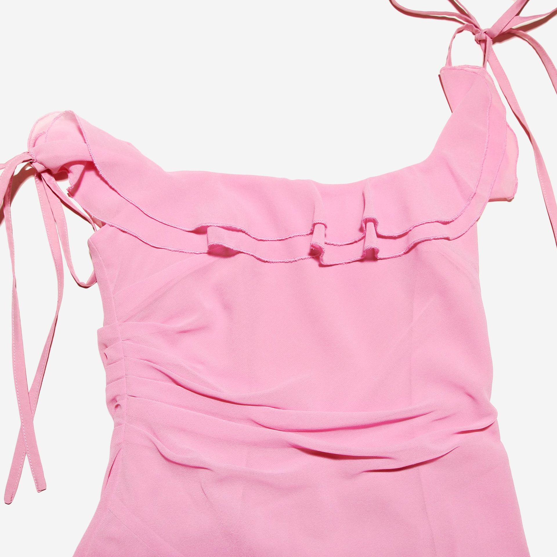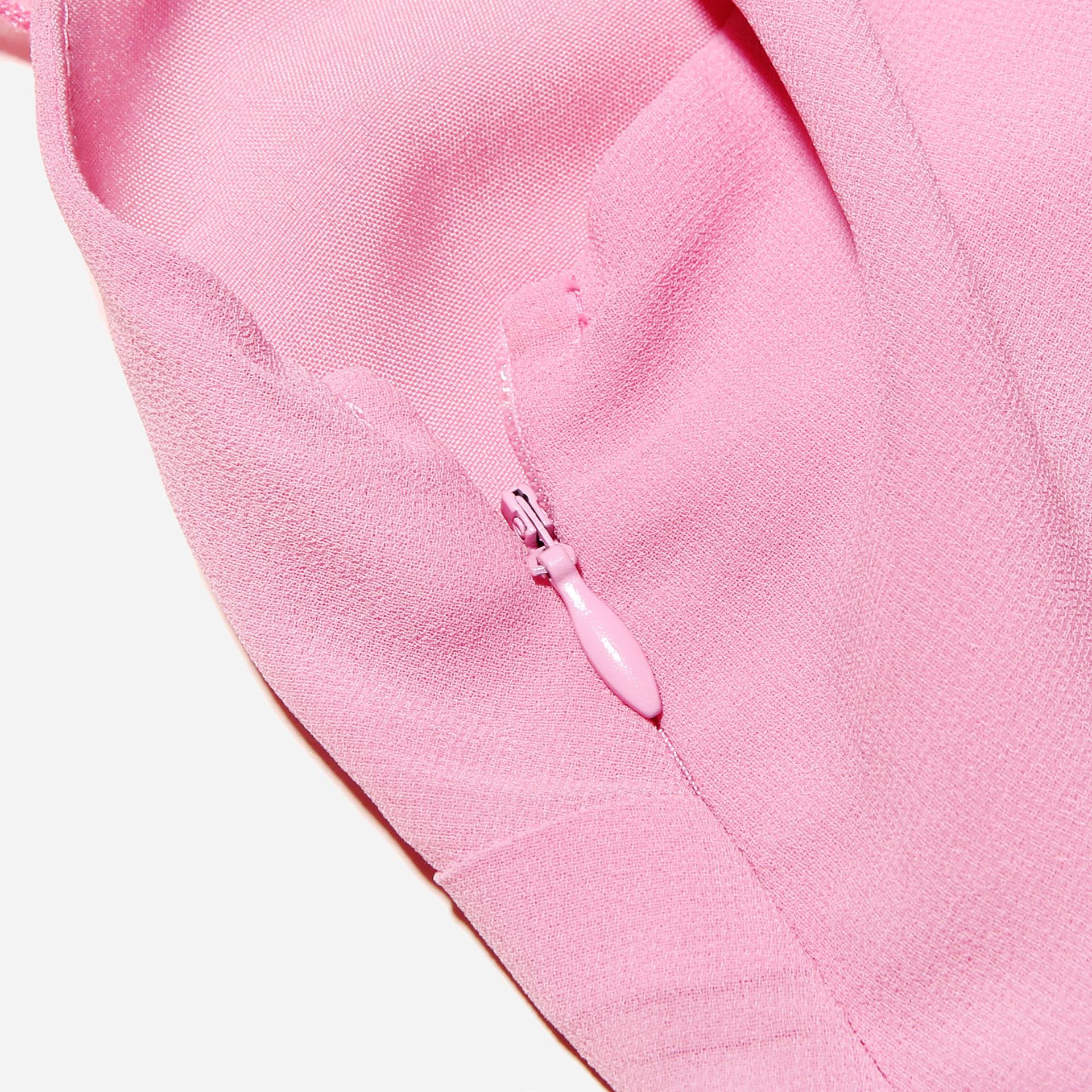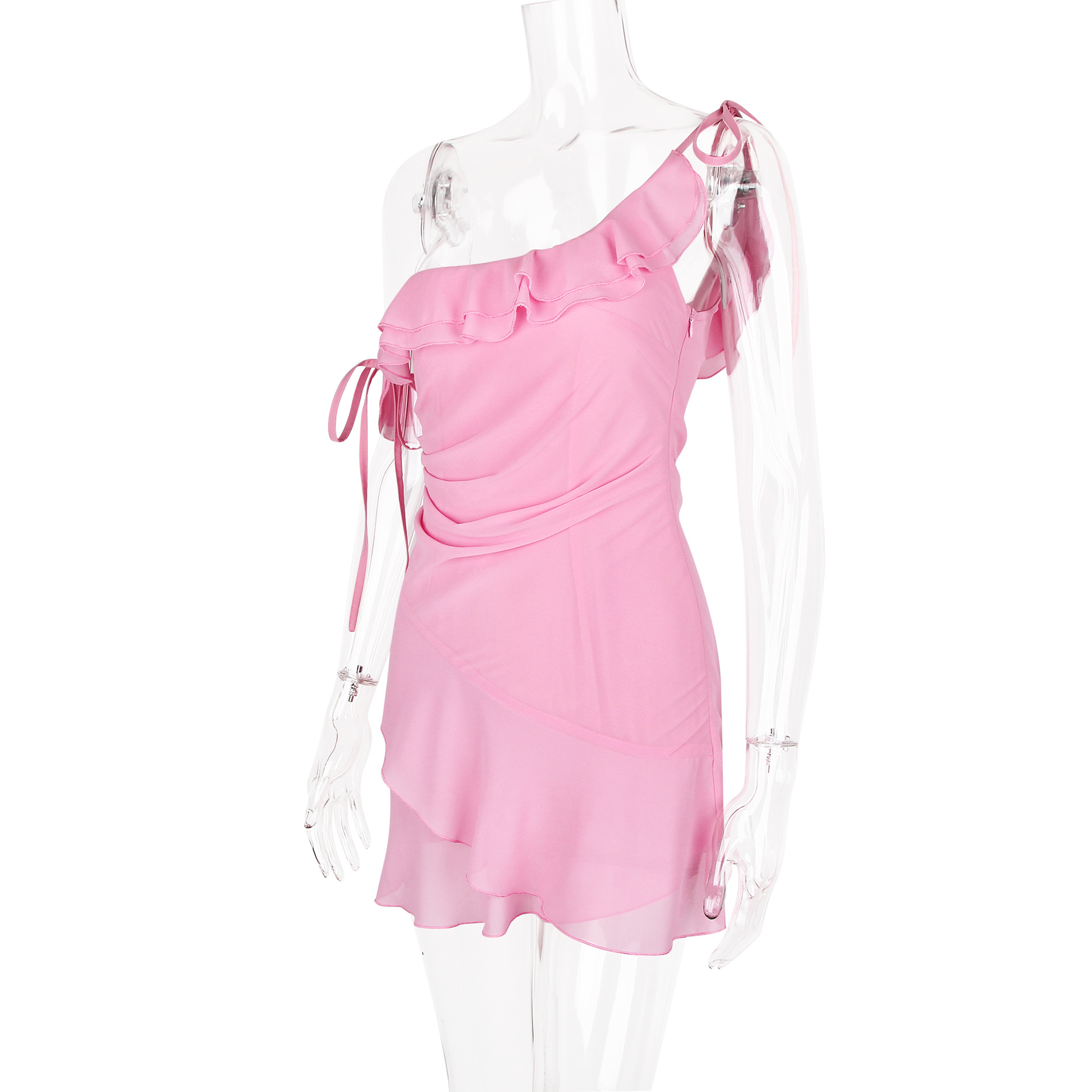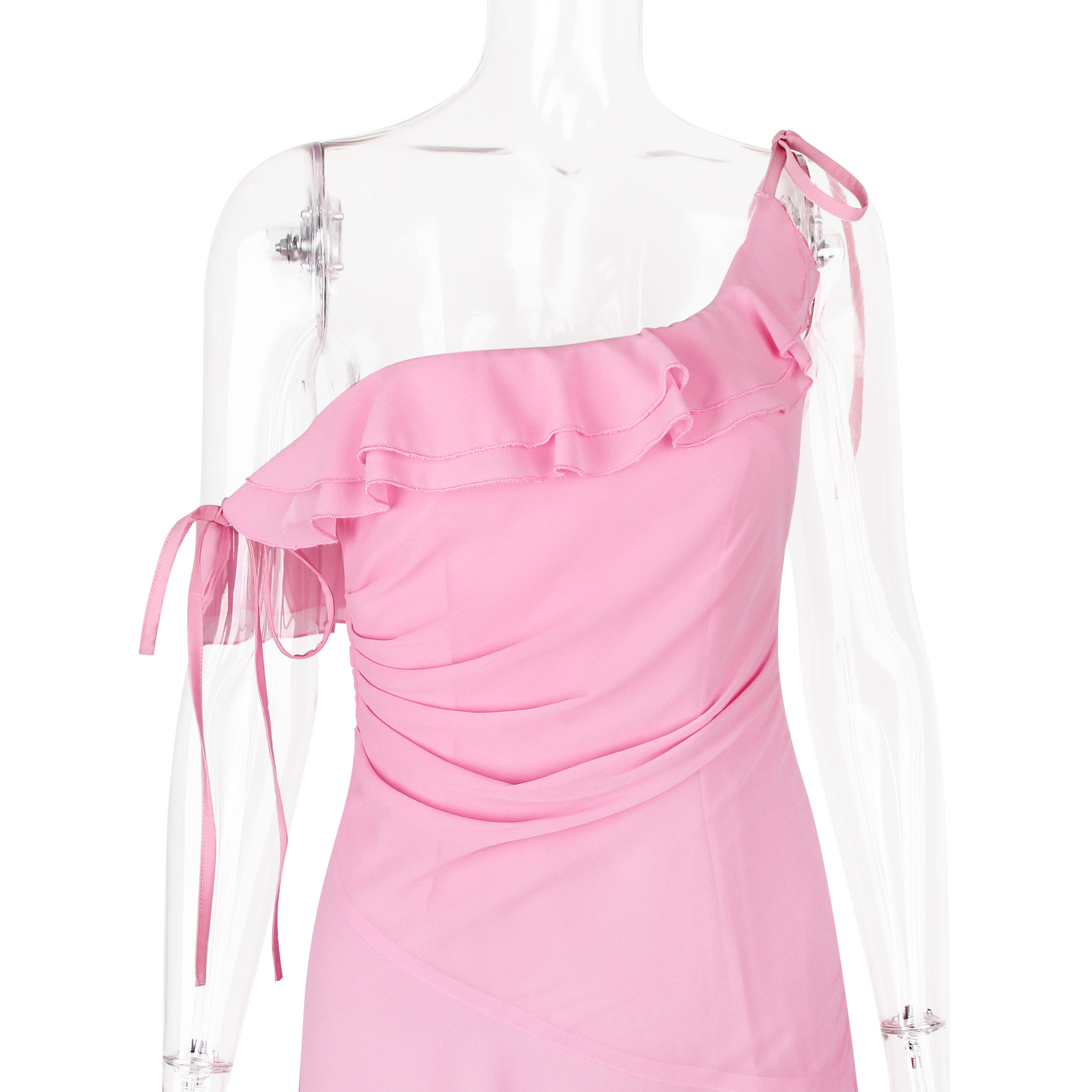 High Grade Chiffon Ruffled Oblique Shoulder French Dress Sweet Spicy Pink Small