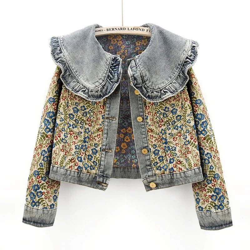 Jacquard Denim Jacket Peter Pan Collar Outwear