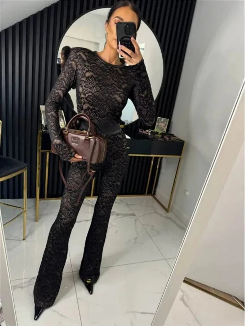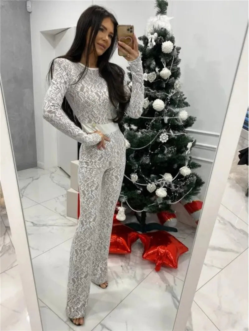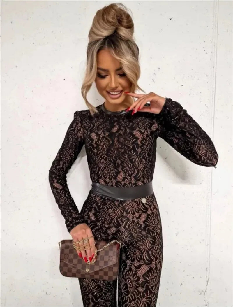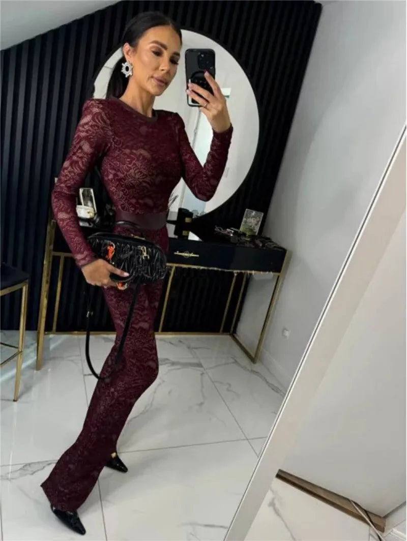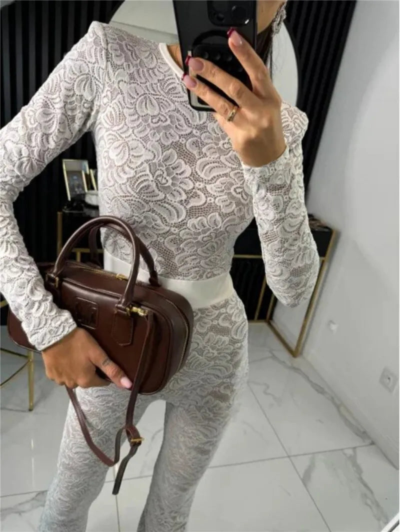 Lace Print Long Sleeve Two Layer Jumpsuits