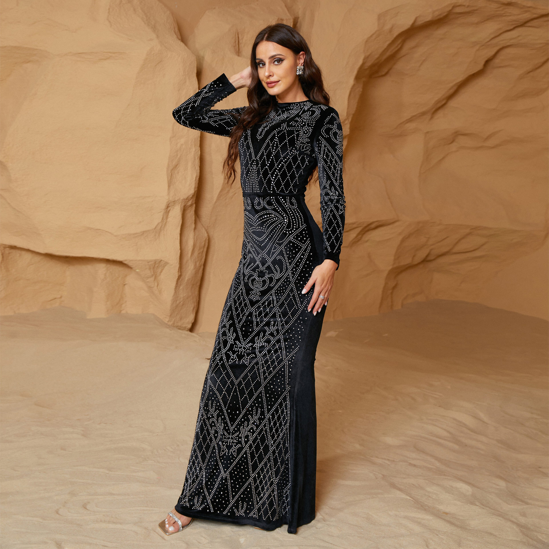 Long Sleeved Crew Neck Slim Fit Long Rhinestone Cocktail Evening Dress Bridesmaid Dress for