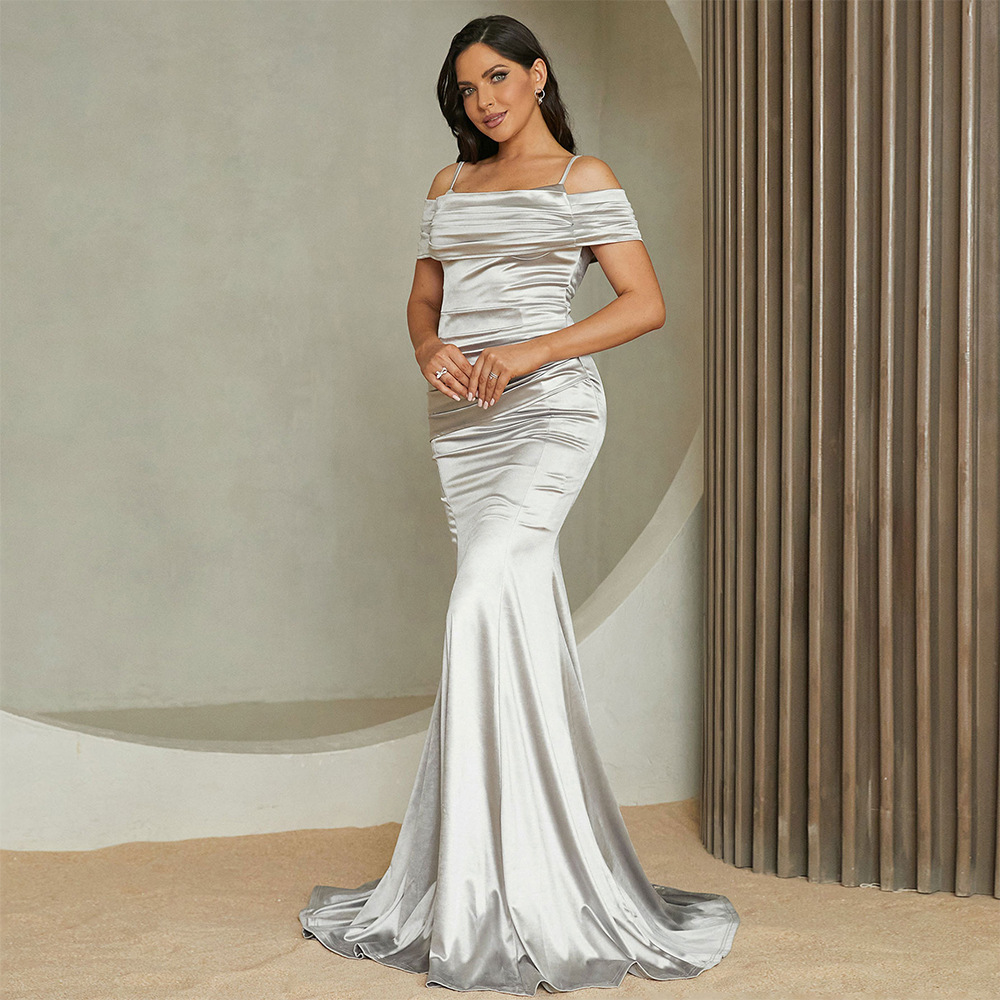 Off Neck Sleeveless Elegant Slim Fit Long Solid Color Cocktail Bridesmaid Dress Evening Dress