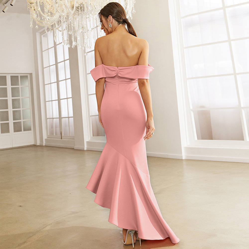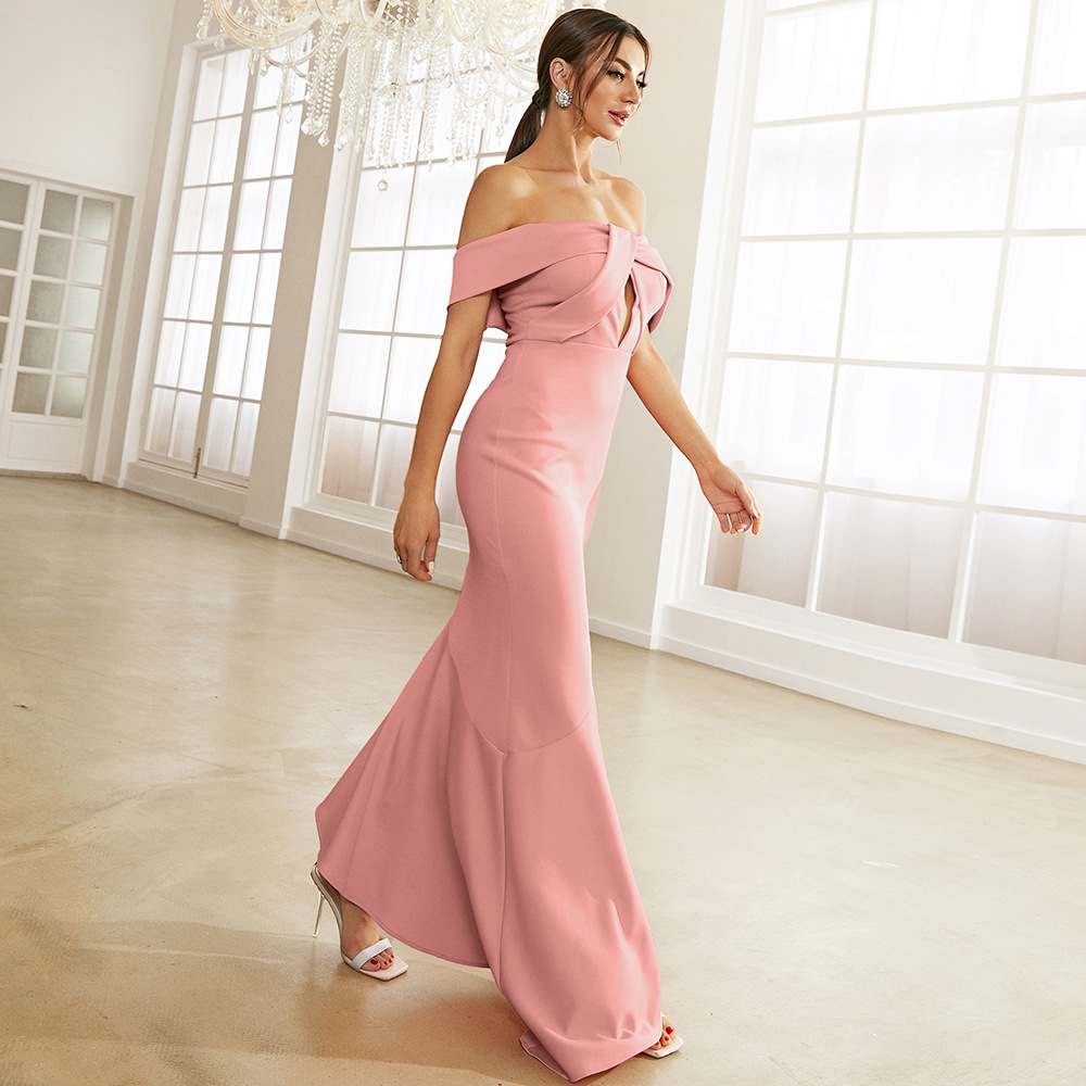 off-Neck Sleeveless Elegant Slim-Fit Long Solid Color Cocktail Bridesmaid Dress Evening Dress Ruffle