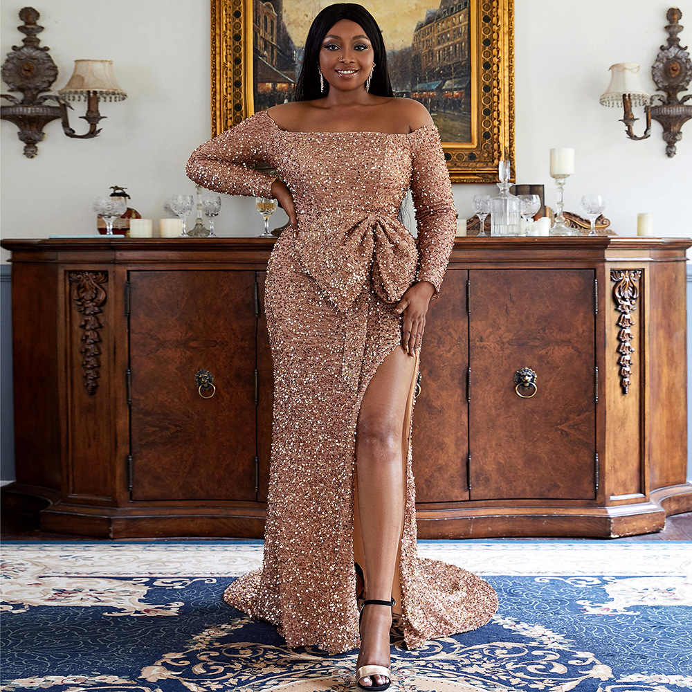 Plus Size Long Sequined off Neck Long Sleeve Cocktail Evening Dress Bridesmaid Dress