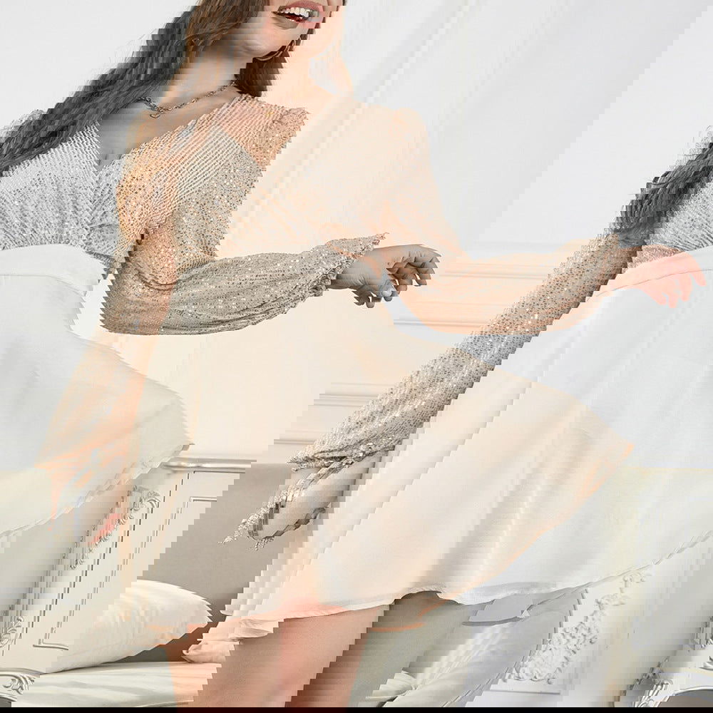 Plus Size Sequin Stitching Gauzy Gown Cross Long Sleeves Party Dress