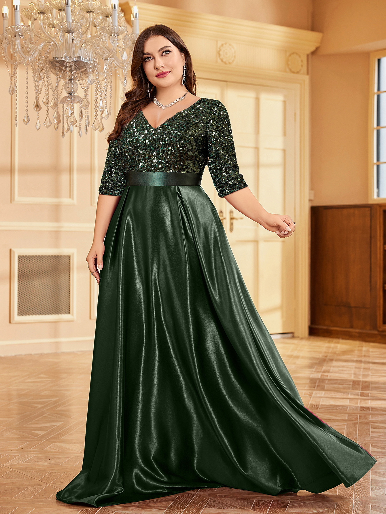 Plus Size V neck Long Sleeve Sequined Elegant Prom Evening Dress Party Dress