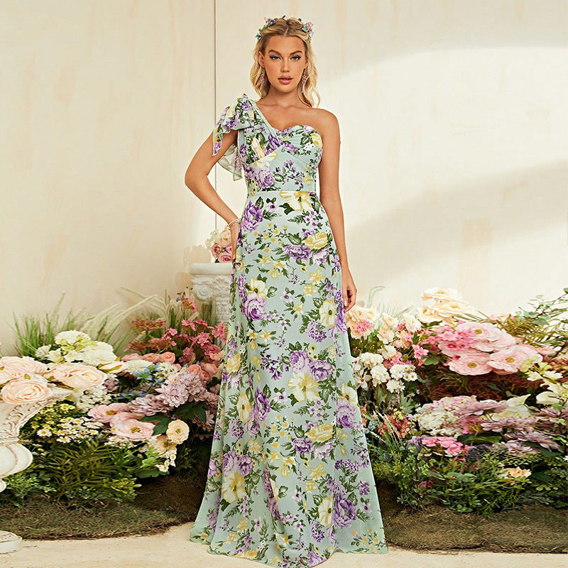 Printed Sleeveless Fitted Waist Backless One Shoulder Dress
