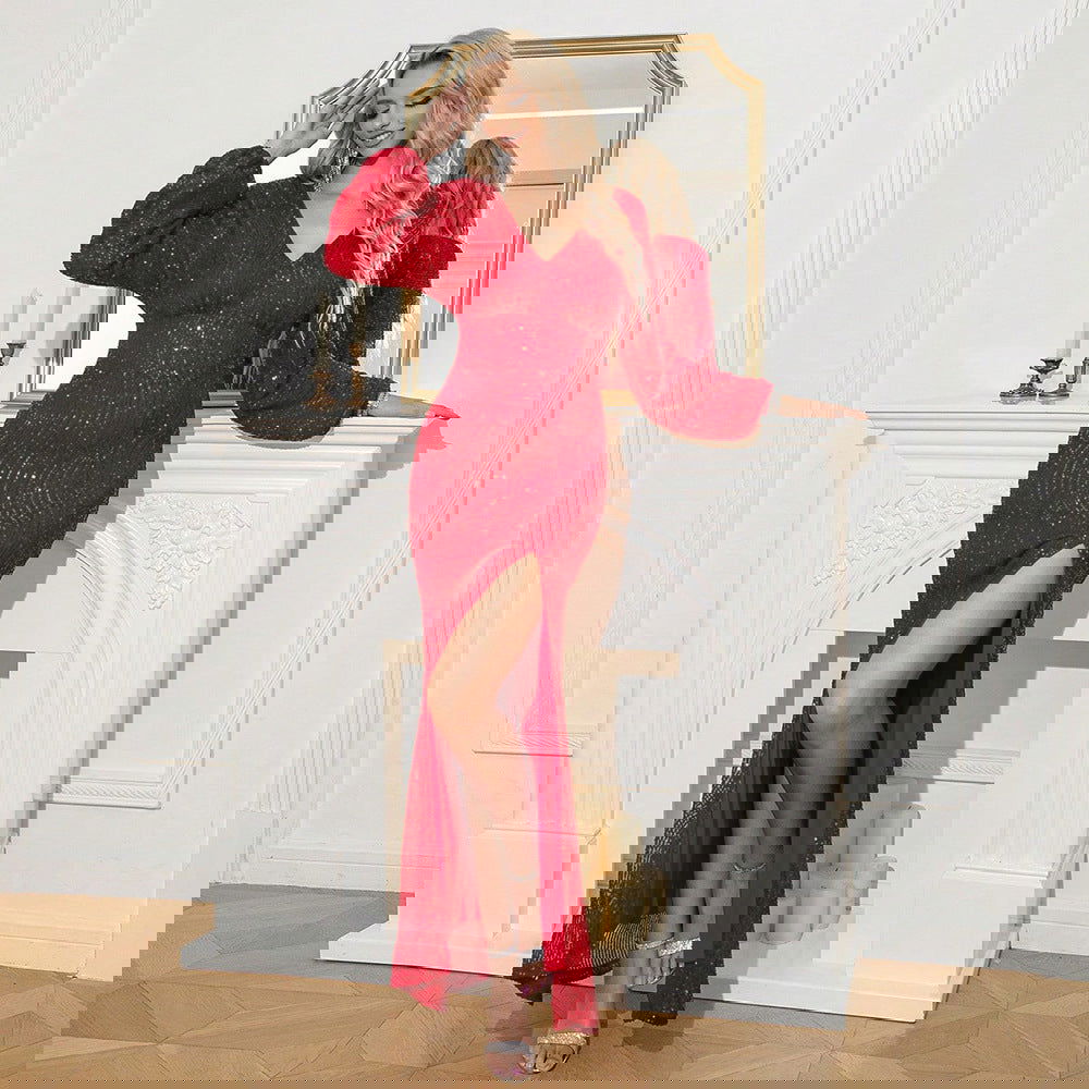 Puff Sleeve Deep V Plunge High Slit Sequined Cocktail Dress