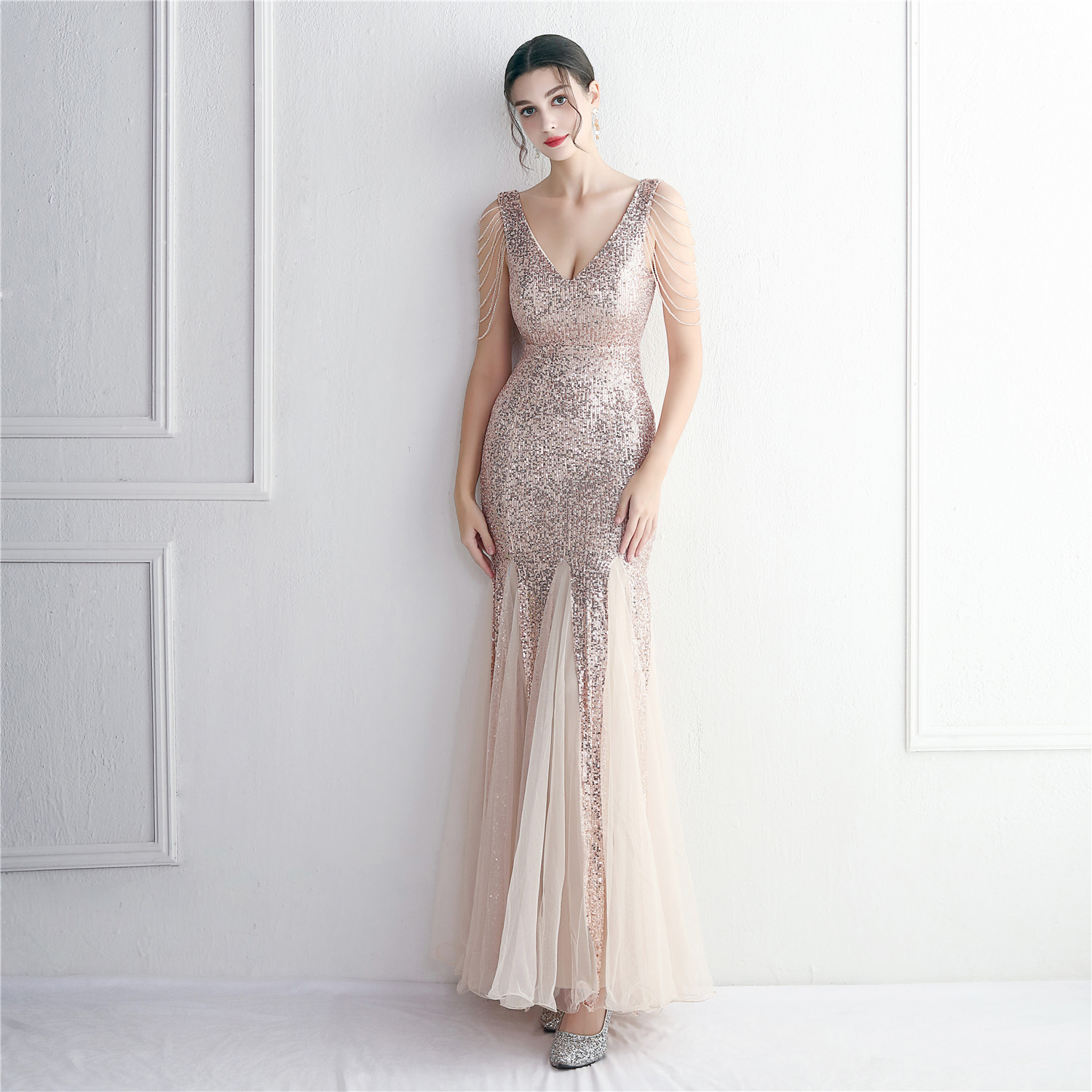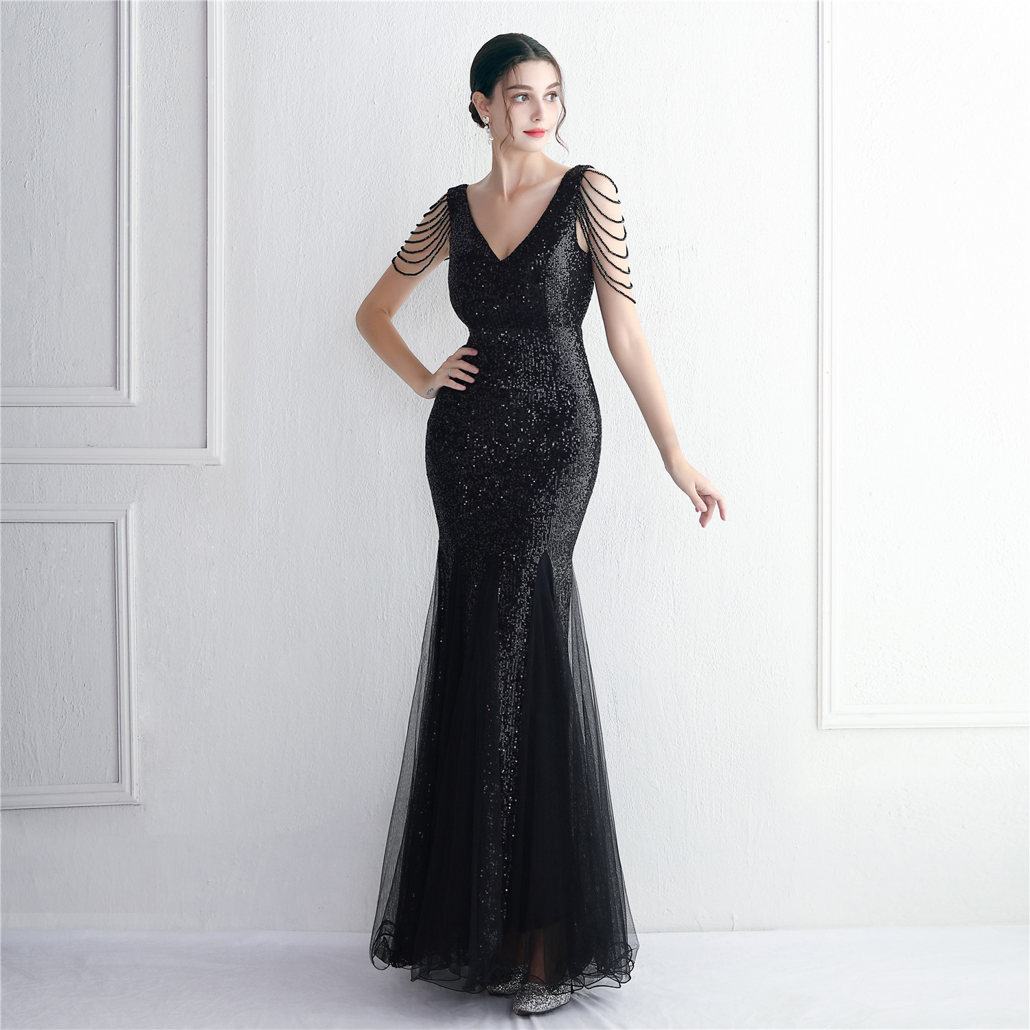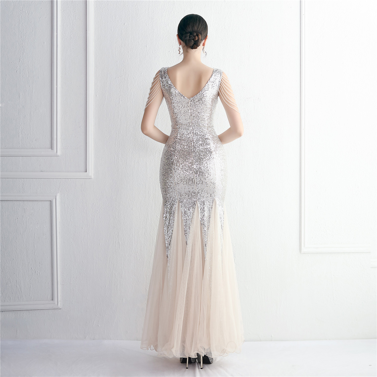 Sequin Mesh Craft Beaded Party Dress Long Cocktail Slim Fit Evening Dress Elegant Long