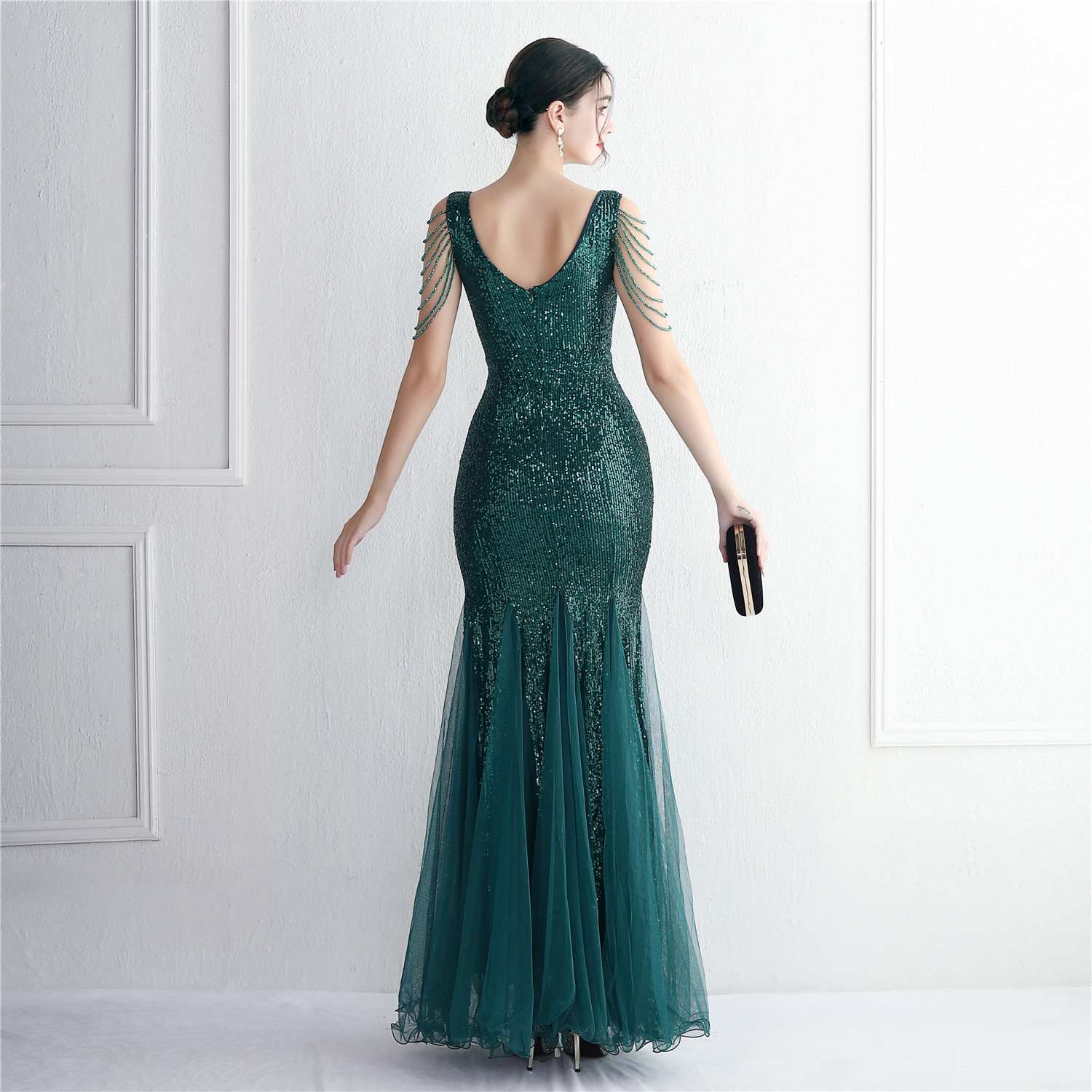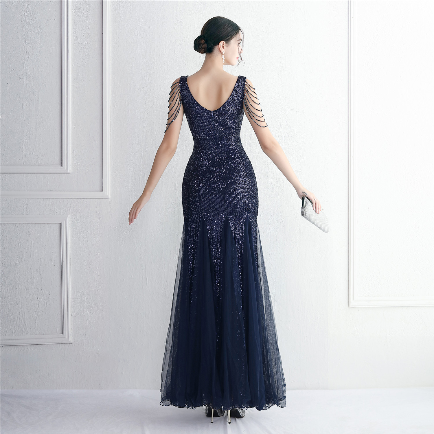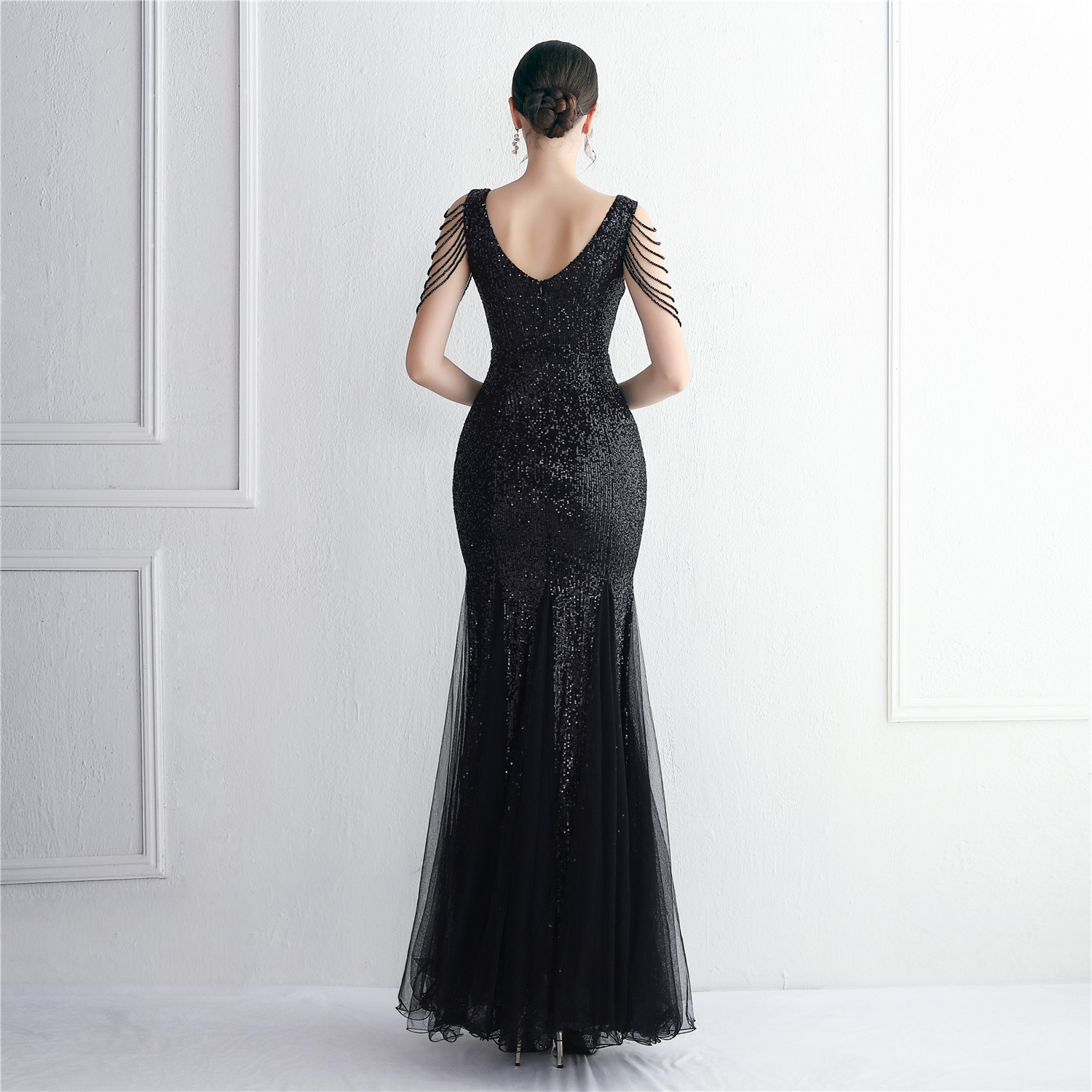 Sequin Mesh Craft Beaded Party Dress Long Cocktail Slim Fit Evening Dress Elegant Long