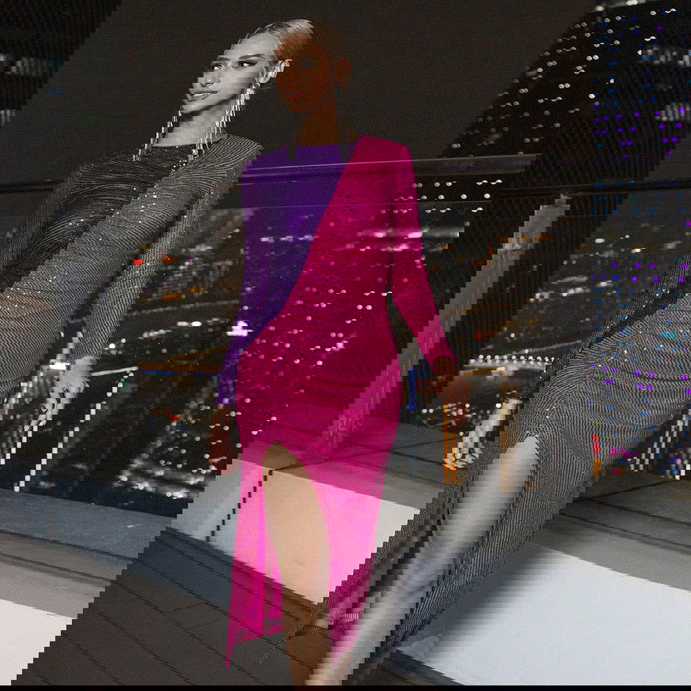 Sequin Stitching Long Sleeve Split Party Nightclub Dress