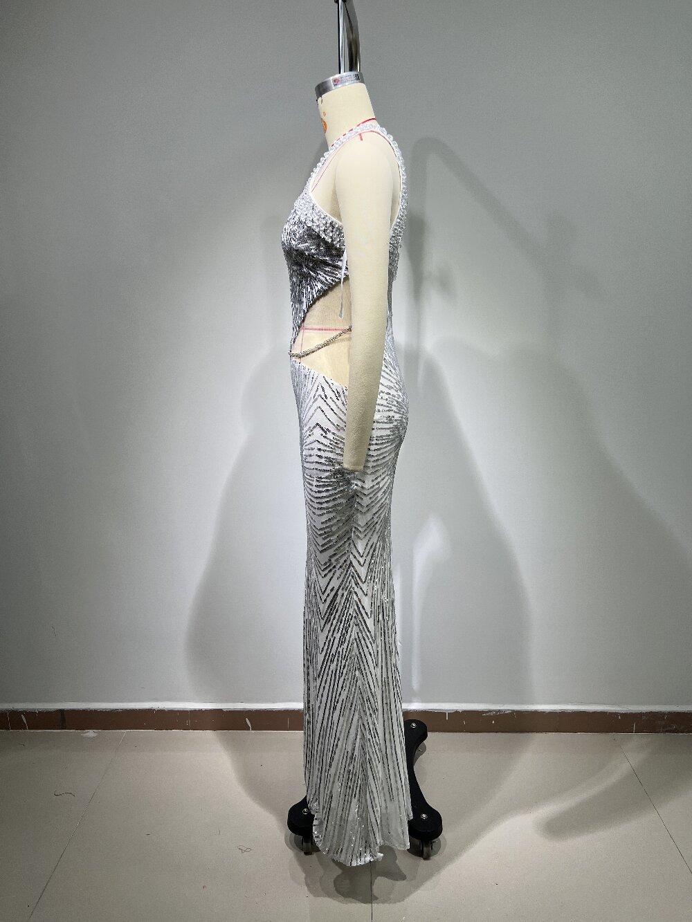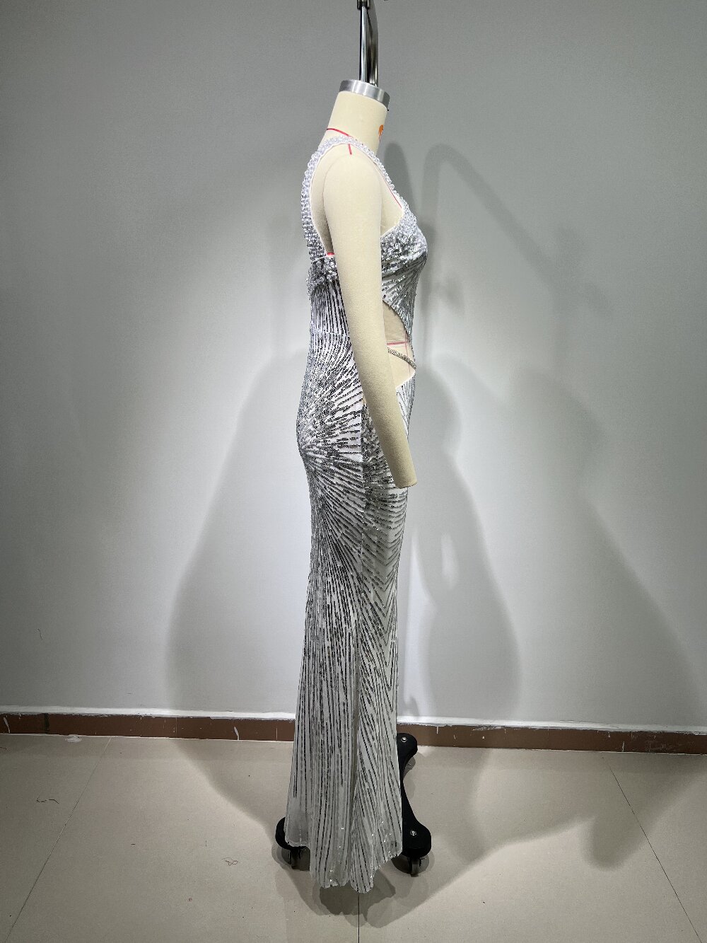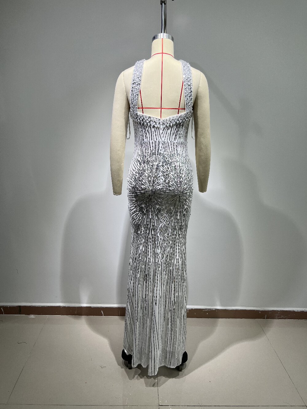 Silver Beaded Diamond Sequin Gauze Cami Dress Backless Red Carpet Dinner Dress
