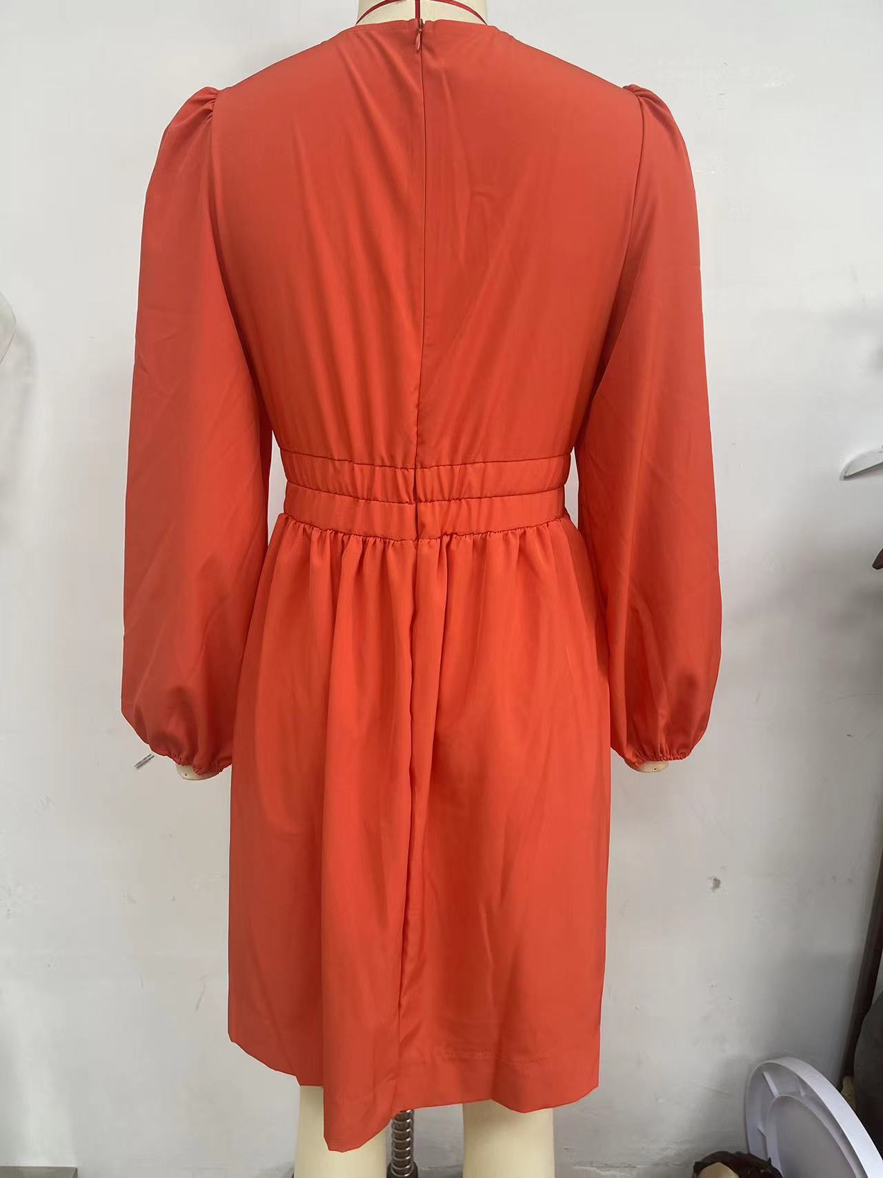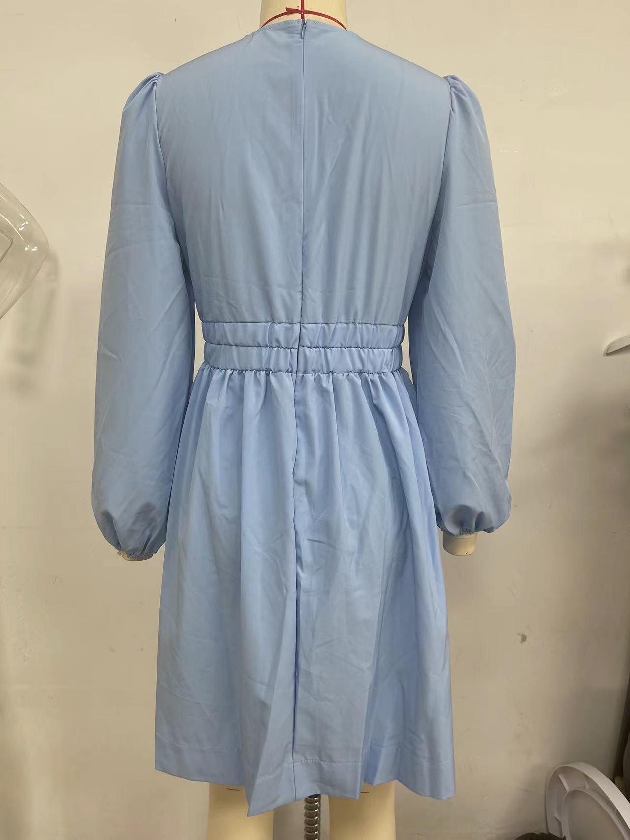 Slimming Deep V Plunge Fitted Waist Pleated Long Sleeve Dress