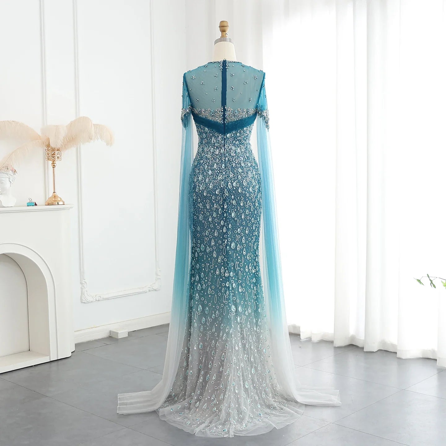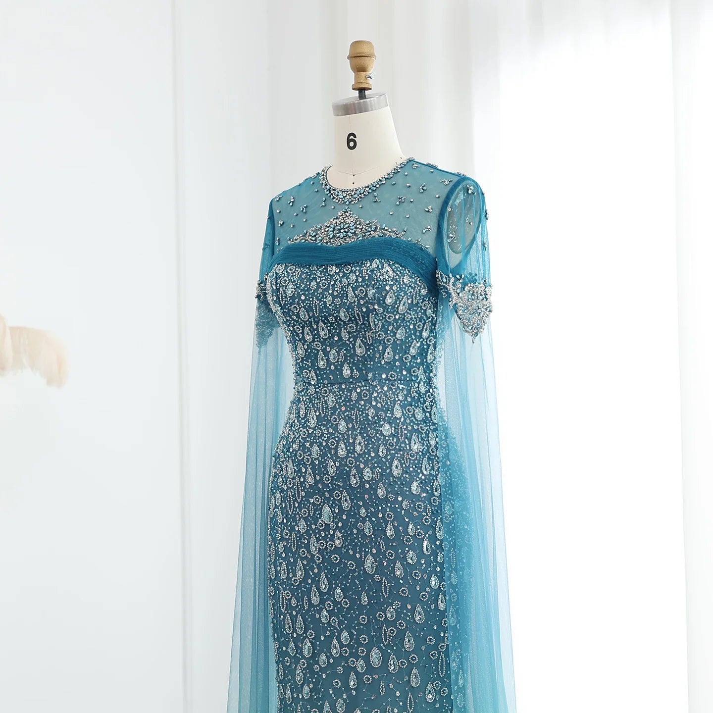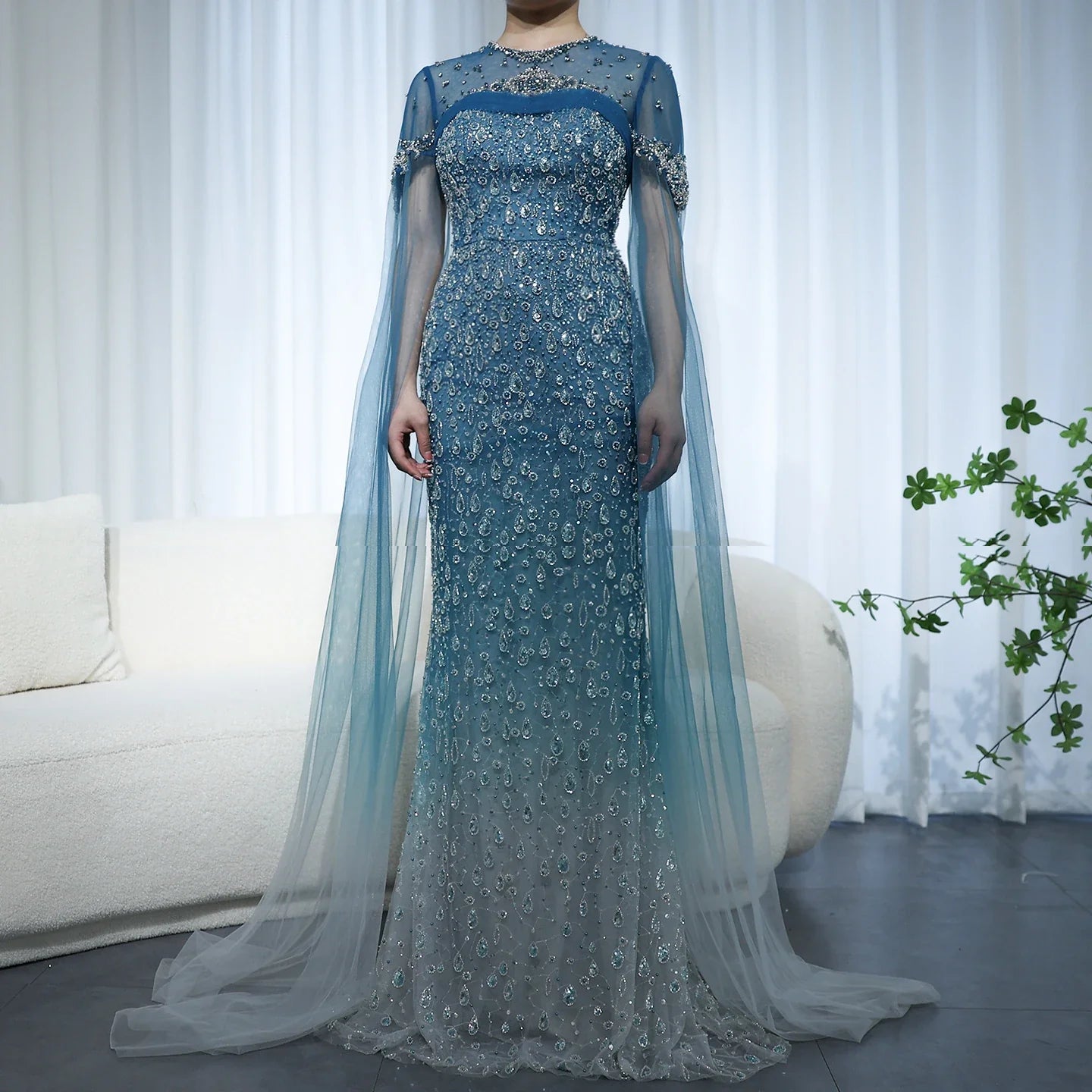 Turquoise Crystal Mermaid Evening Dress With Cape Sleeves