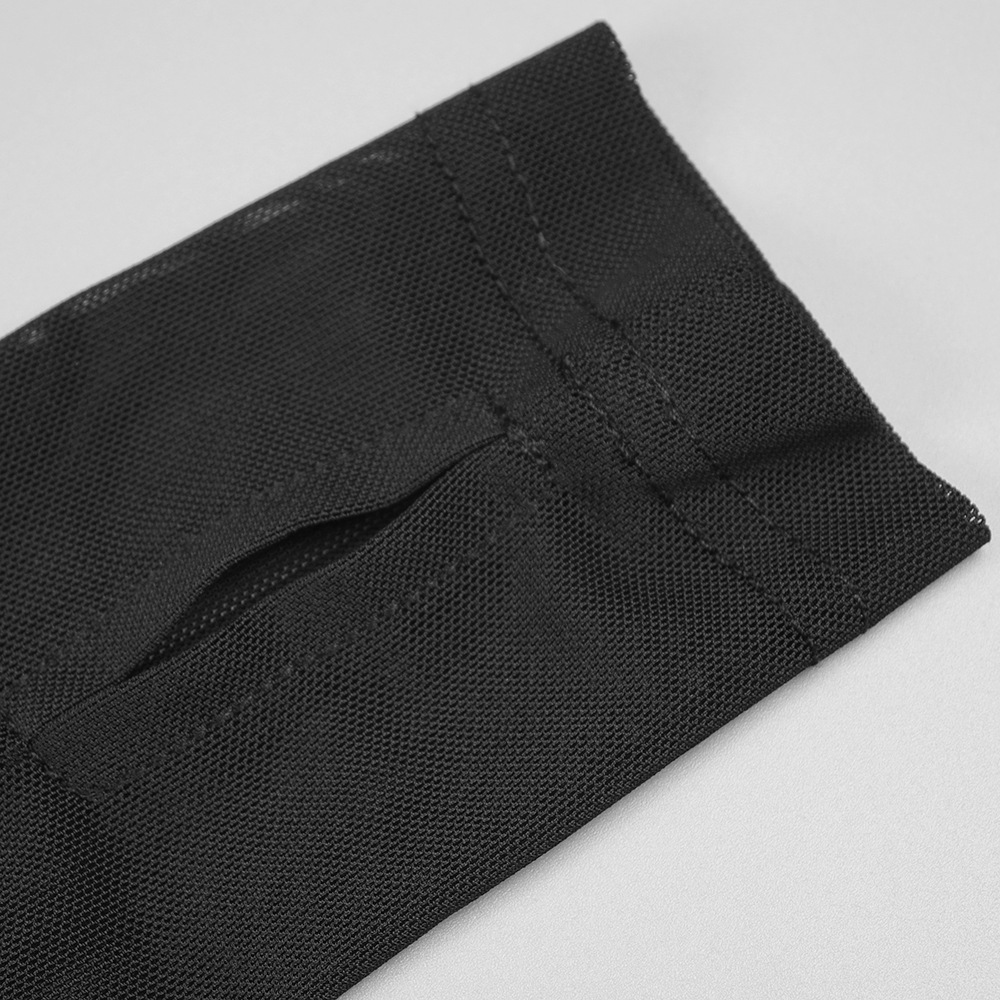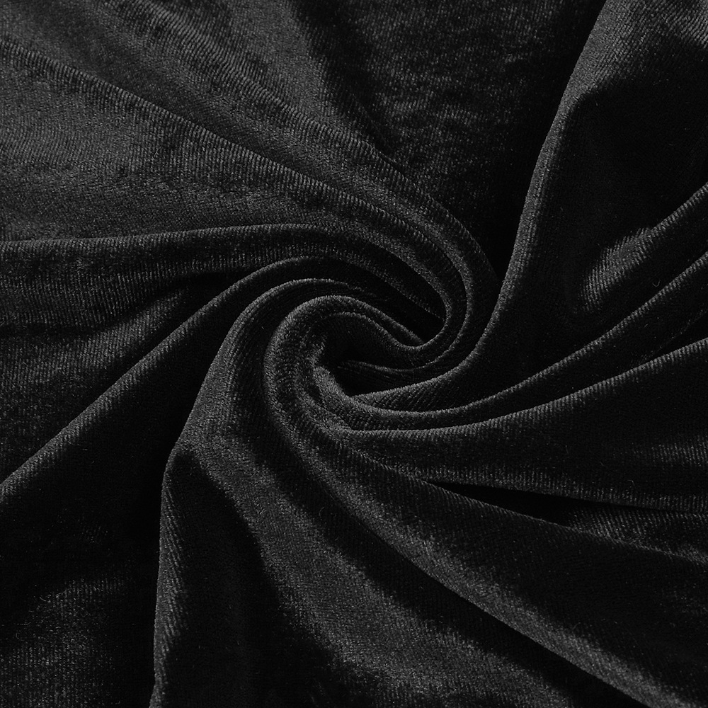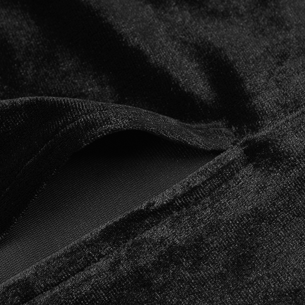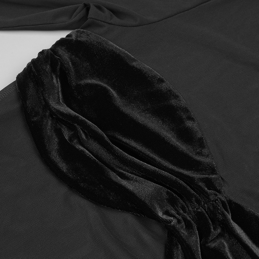 Camisa negra de manga larga con costuras de terciopelo y malla, corte ajustado a la cadera