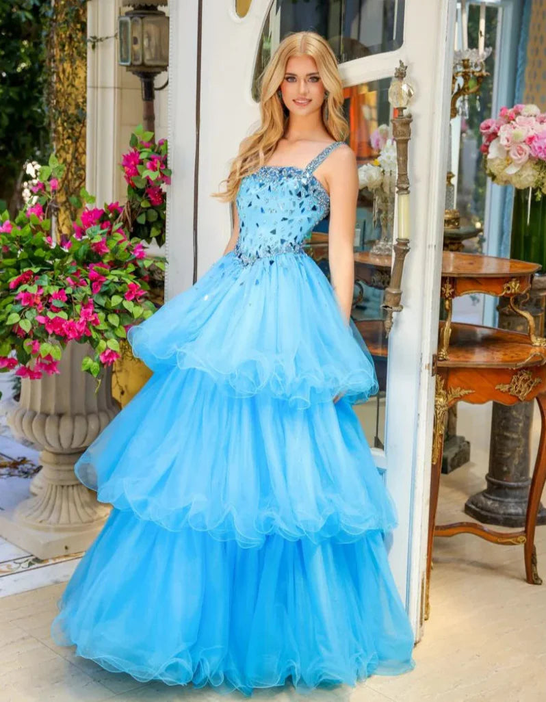 Blue Sparkling Beads Prom Dresses with Tulle Curly Edge