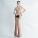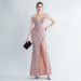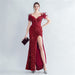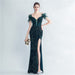 Vestido de noche de cola de pez con lentejuelas de alta densidad y corsé con plumas de avestruz y sujetador de cuerda en la espalda.