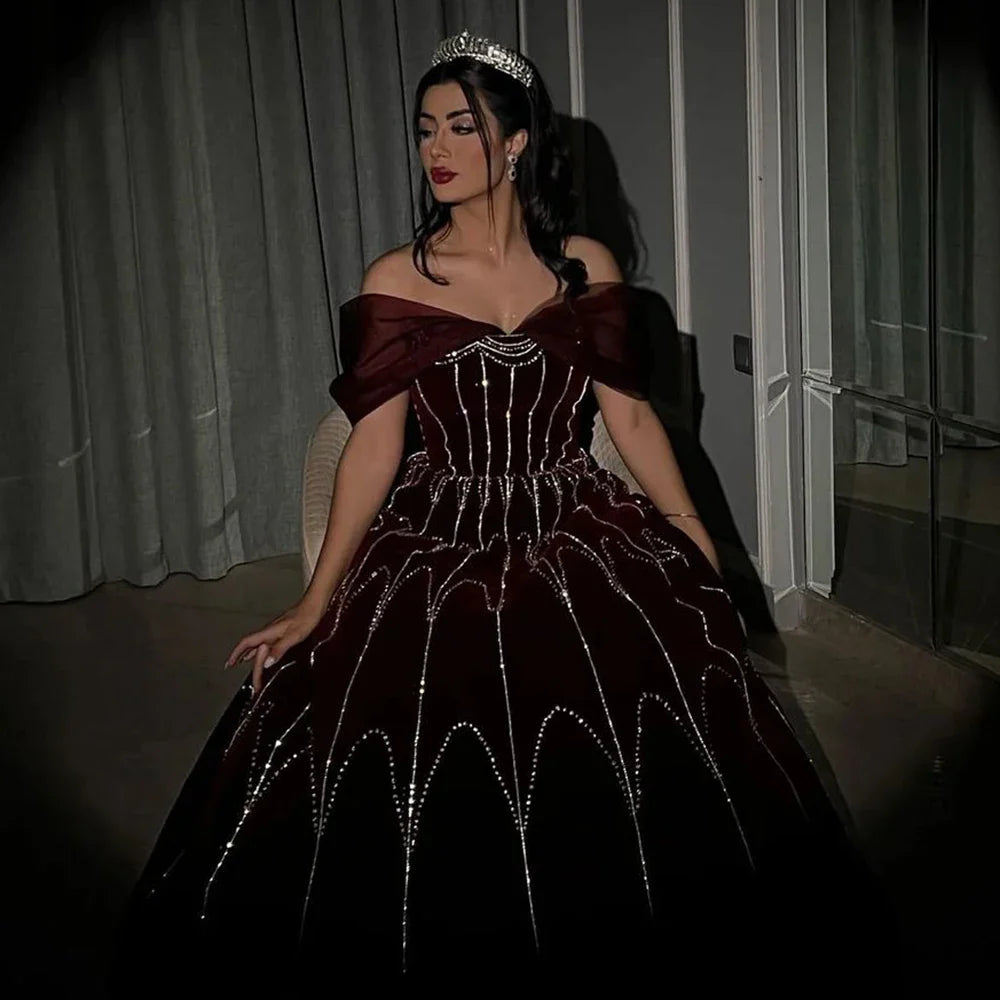 Burgundy Velvet Ball Gown Crystal Evening Dress
