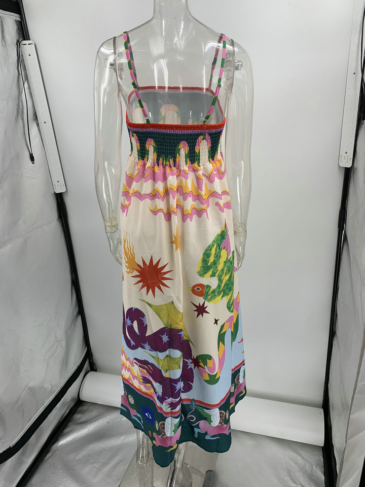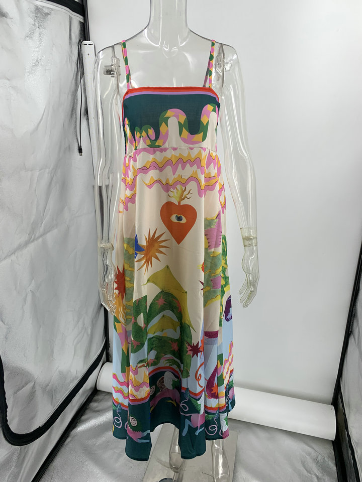 Vestido informal con tirantes finos, estampado floral, sin mangas, vestido con vuelo, artesanía amplificada